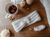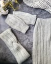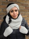 Exact stitch and row counts are provided for the cowl; however, the mittens and the headband are made to measure. The cowl and fingerless mittens also include shaping, allowing for a more tapered effect.