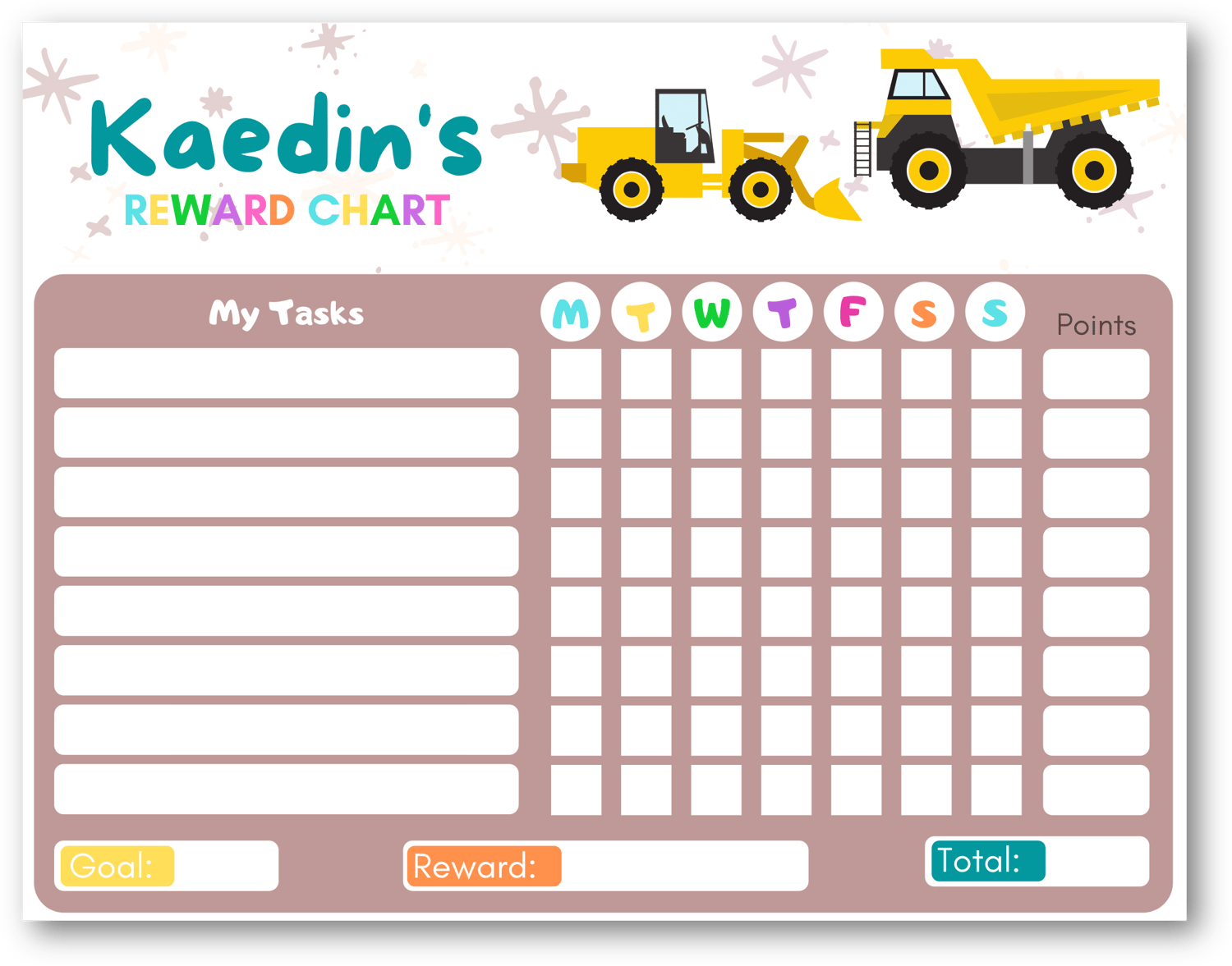 Giving your kids a routine to follow and some responsibility is important. This printable and editable trucks reward chart made just for kids, will help you do just that. Set a goal, offer a reward and keep track of how many points they have! When they reach their goal they get their reward.