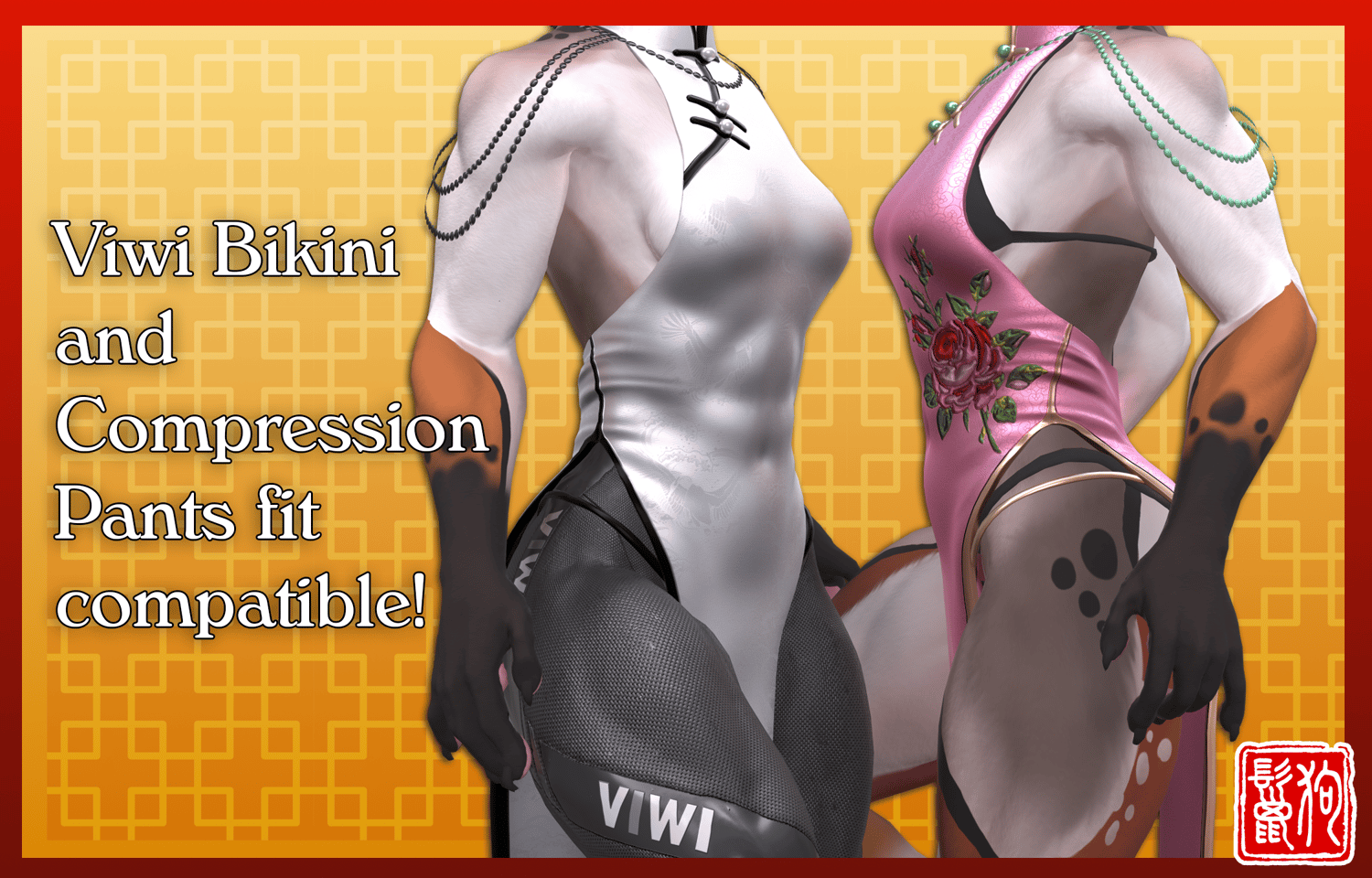 - The qipao is compatible with the Viwi bikini top, bikini bottom and compression pants. There's toggles made to fit them.