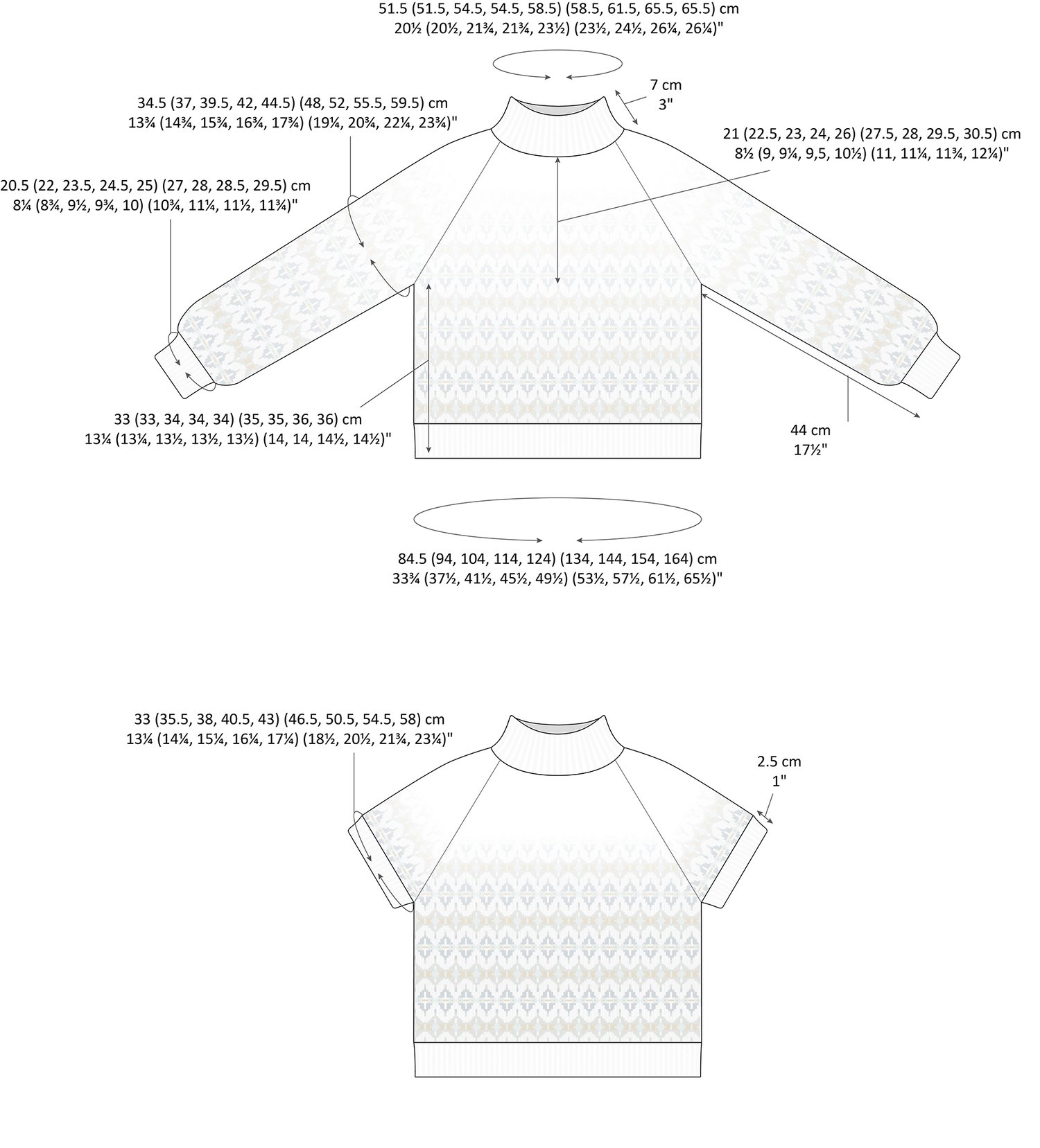 Chest circumference: 84.5 (94, 104, 114, 124) (134, 144, 154, 164) cm/33¾ (37½, 41½, 45½, 49½) (53½, 57½, 61½, 65½)“.