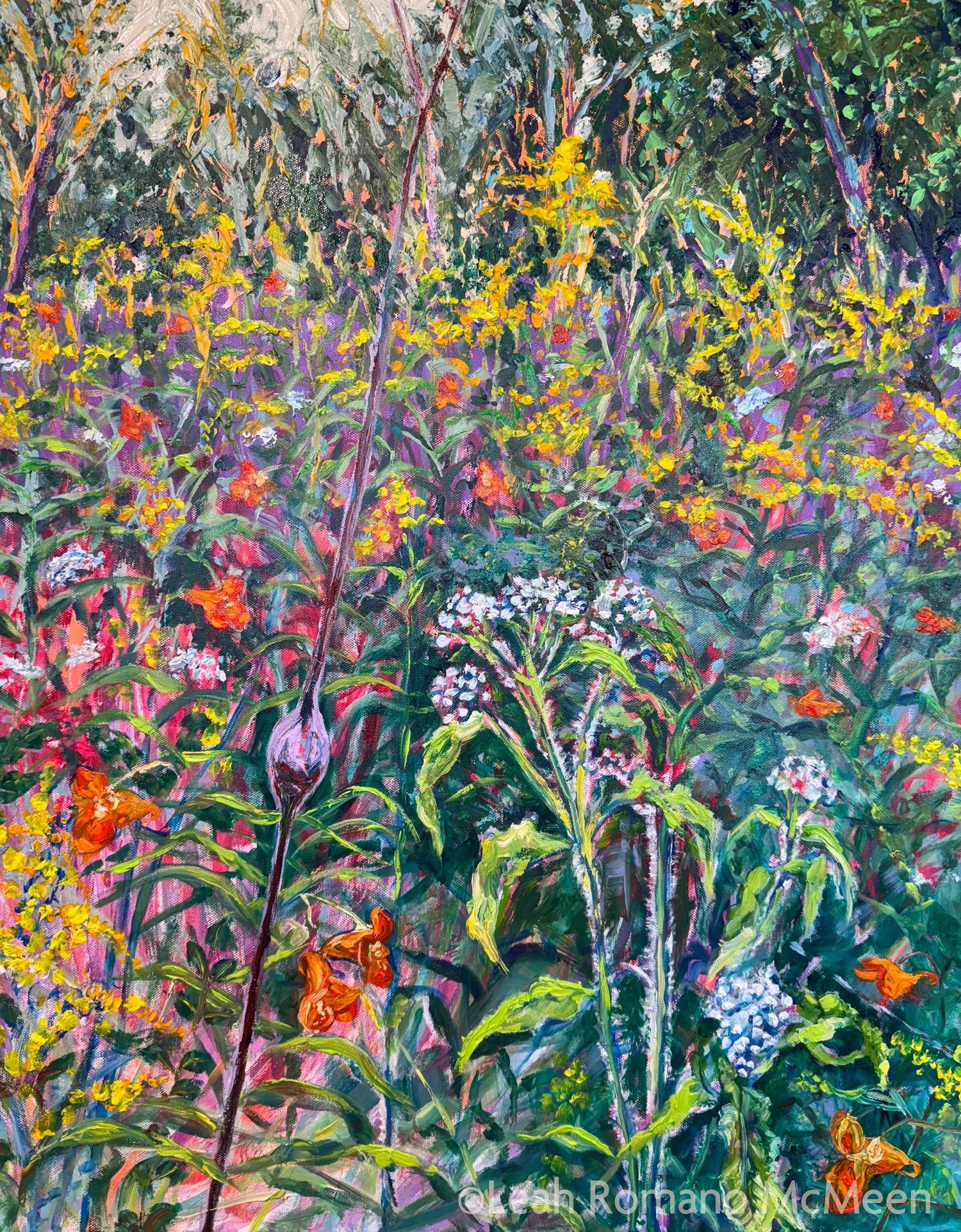 A meadow of Jewelweed, Boneset, and Goldenrod. A woody stalk serves as the conductor baton giving structural direction for the eye. Impasto brushstrokes and a lot of movement