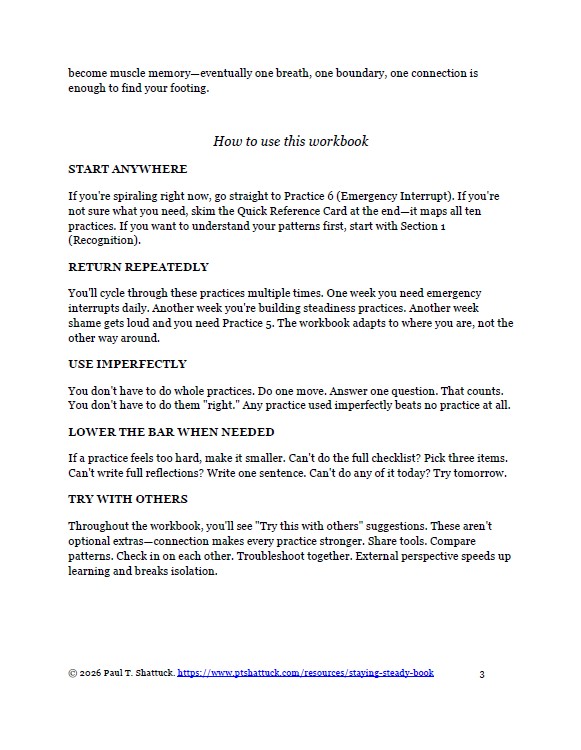 75+ pages. Ten complete practices across four sections. A hands-on workbook: checklists, self-assessments, mapping exercises, menus of concrete moves, and structured prompts you'll write in and return to. Built to be used in the middle of the chaos.