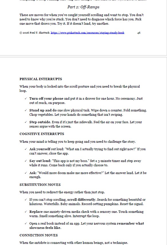 - Doomscroll Rescue — menu of off-ramps organized by type of move: physical interrupts, cognitive interrupts, substitution moves, boundary moves