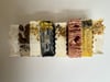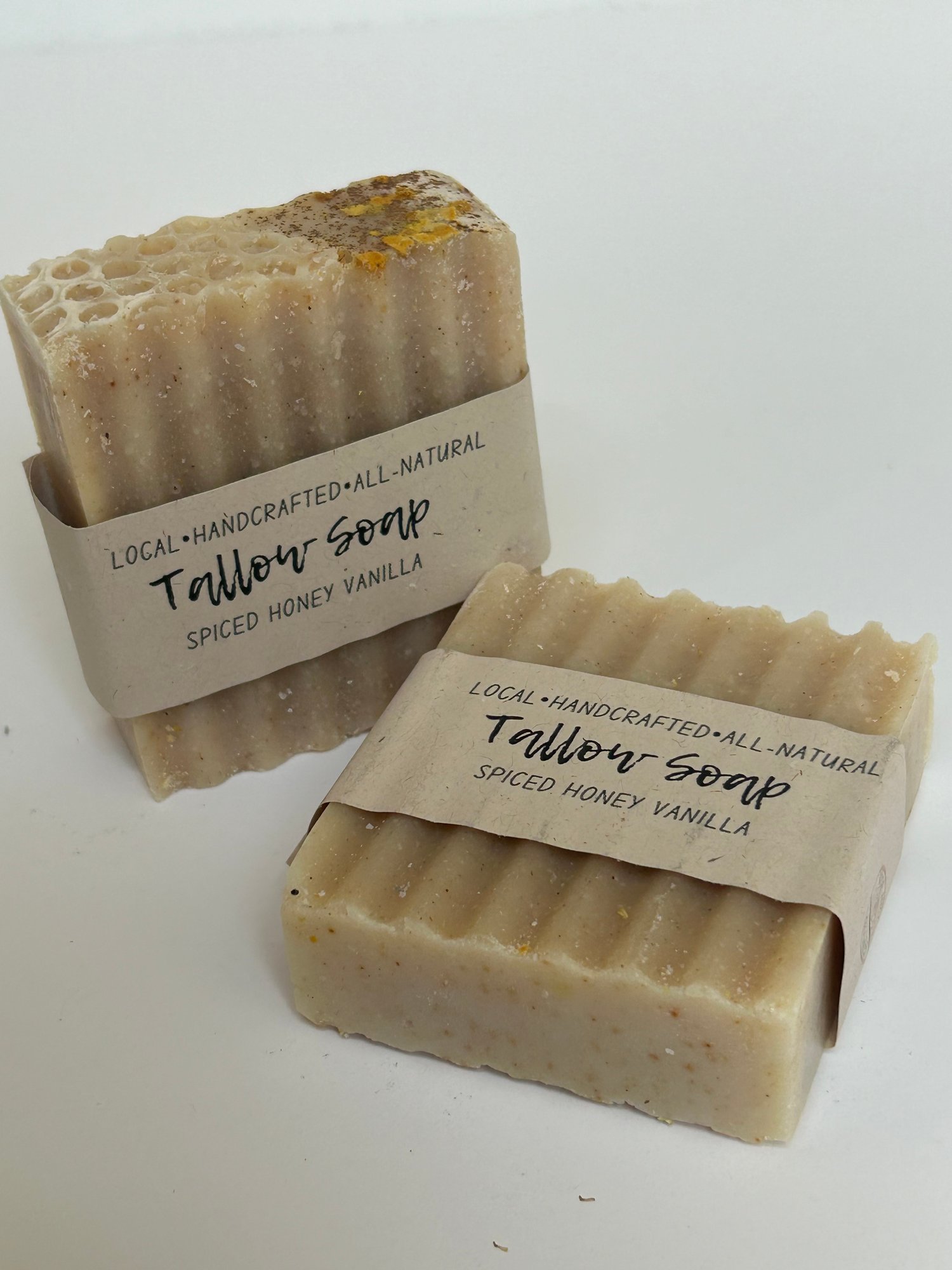 Spiced Honey Vanilla: Tallow infused with vanilla beans and cinnamon stick, jojoba oil, olive oil, coconut oil, water, sodium hydroxide, honey, cinnamon, and essential oils of vanilla and cinnamon. Topped with lavender cinnamon and bee pollen.