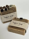 Coffee Scrub: Tallow infused with dark roast coffee, olive oil, coconut oil, water, sodium hydroxide, cocoa powder, and vanilla essential oil.