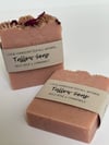 Wild Rose & Chamomile: Tallow infused with chamomile, olive oil, coconut oil, water, sodium hydroxide, French pink clay, honey, and essential oils of rosewood and geranium. Topped with rose petals and hibiscus powder.
