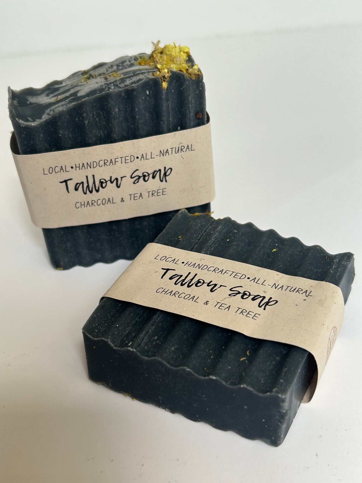 Charcoal & Tea Tree: Tallow infused with helichrysum, olive oil, coconut oil, water, sodium hydroxide, aloe, and tea tree essential oil. Topped with helichrysum flowers.