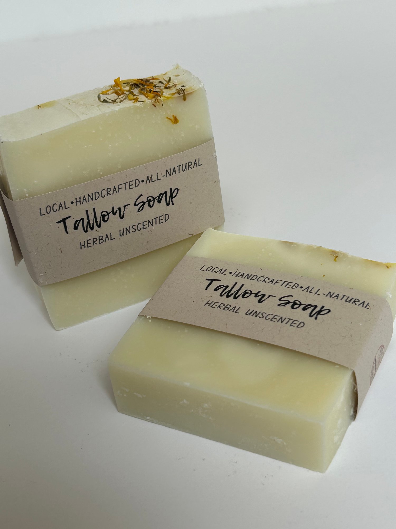 Herbal Unscented: Tallow infused with calendula, yarrow, comfrey, chamomile, and helichrysum, olive oil, coconut oil, water, sodium hydroxide, and topped with flowers.