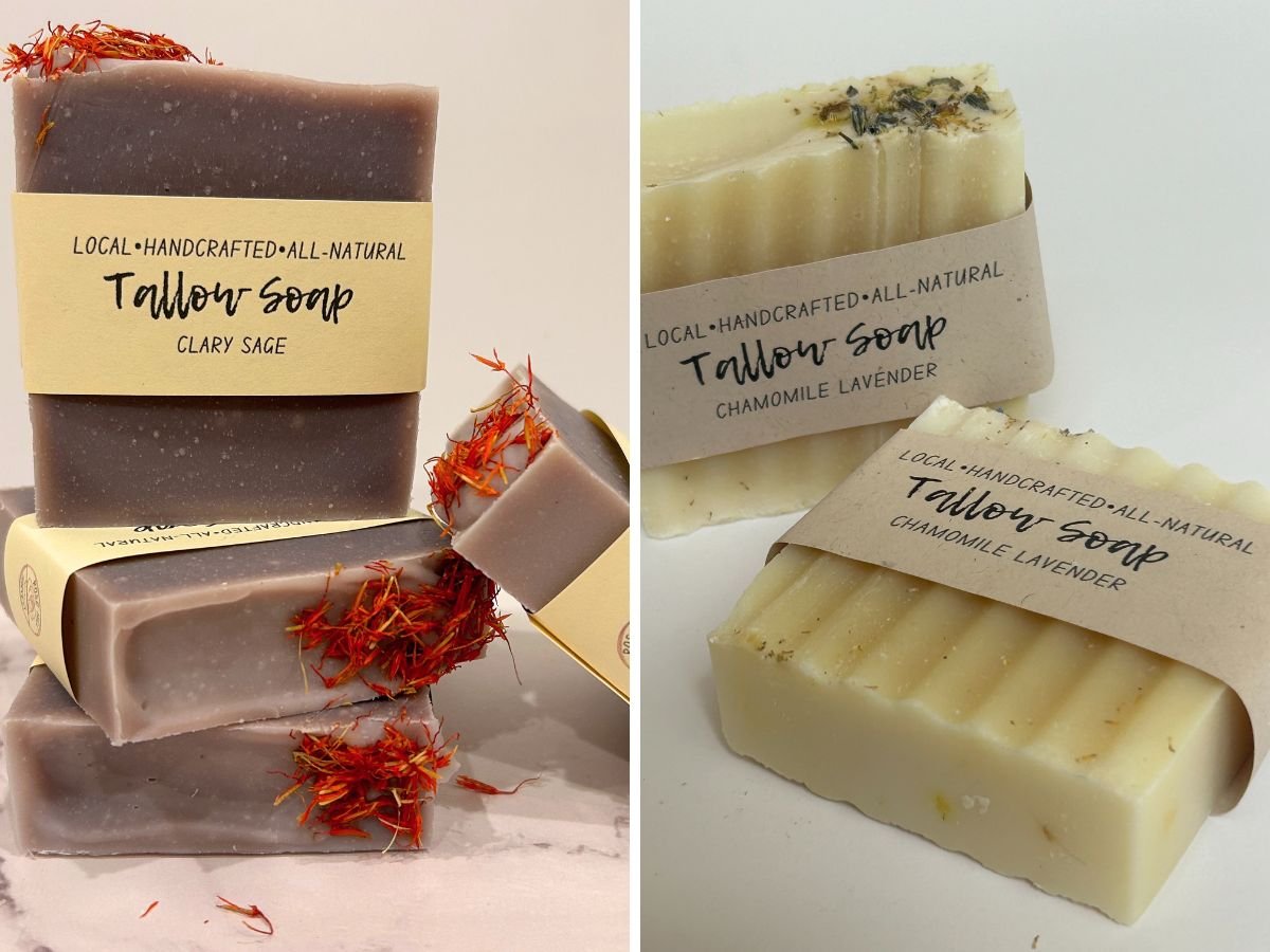 Chamomile Lavender: Tallow infused with chamomile, lavender, and butterfly pea flowers, olive oil, coconut oil, water, sodium hydroxide, and essential oils of lavender. Topped with lavender buds and chamomile flowers.
