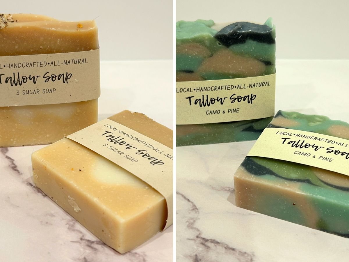 Camo Pine: Tallow infused with spruce tips, olive oil, coconut oil, water, sodium hydroxide, french green clay, aloe power, spirulina, activated charcoal, and scots pine essential oil.