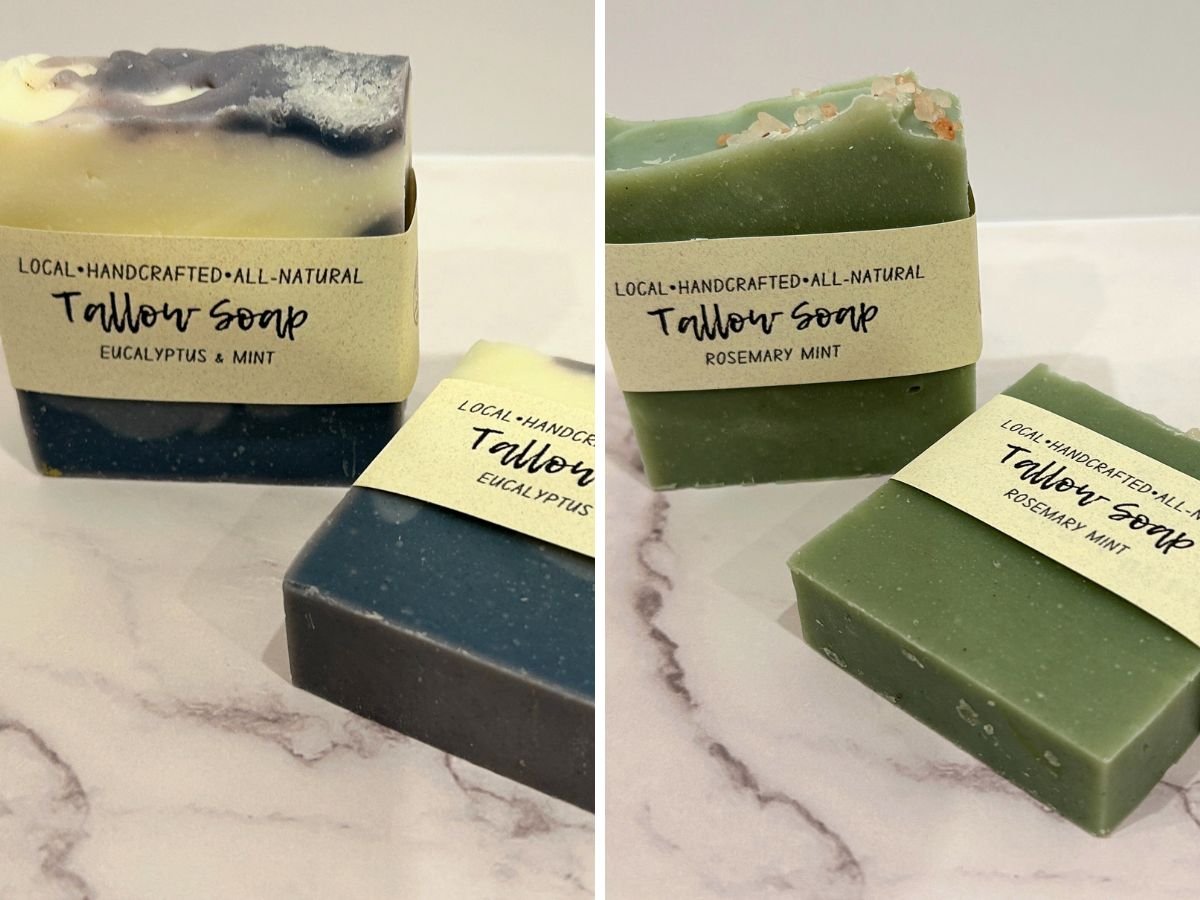 Rosemary Mint: Tallow (infused with rosemary), olive oil, coconut oil, water, sodium hydroxide, french green clay, blue spirulina, essential oils of rosemary and peppermint, with pink Himalayan salt.