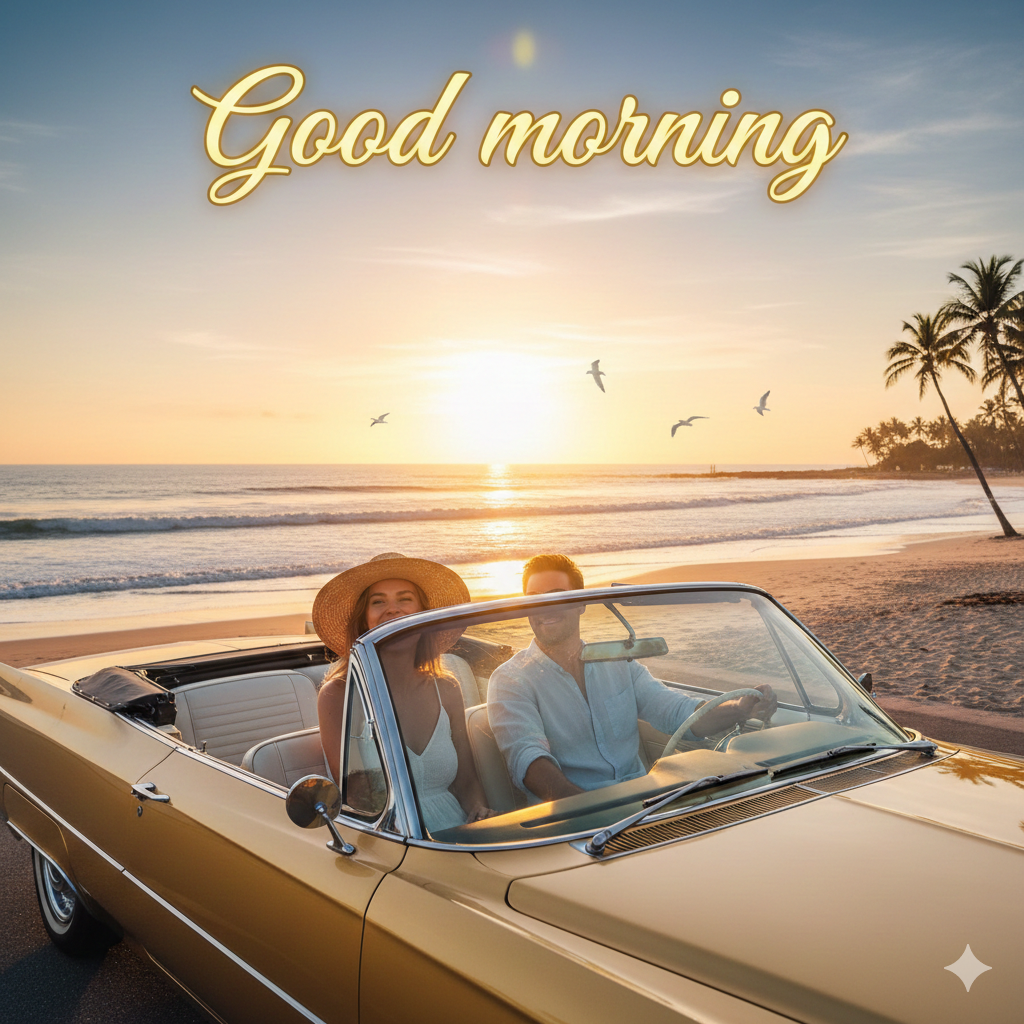 A stunning good morning sunrise scene of a happy couple driving an old classic convertible car along a scenic beach road. The top is down, soft ocean breeze flowing through their hair as they smile and enjoy the peaceful morning. The sun is rising over the horizon, casting warm golden light across the calm ocean waters. Gentle waves roll onto the sandy shore, and palm trees line the coastal road. The sky is painted with soft shades of orange, pink, and light blue. Seagulls fly in the distance, and the atmosphere feels romantic, joyful, and peaceful.