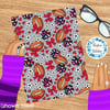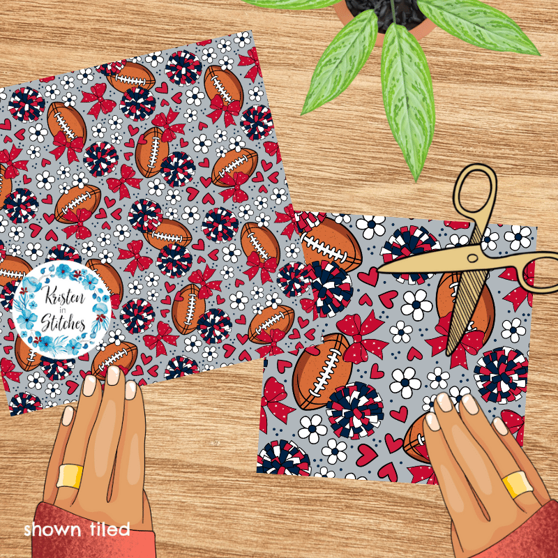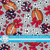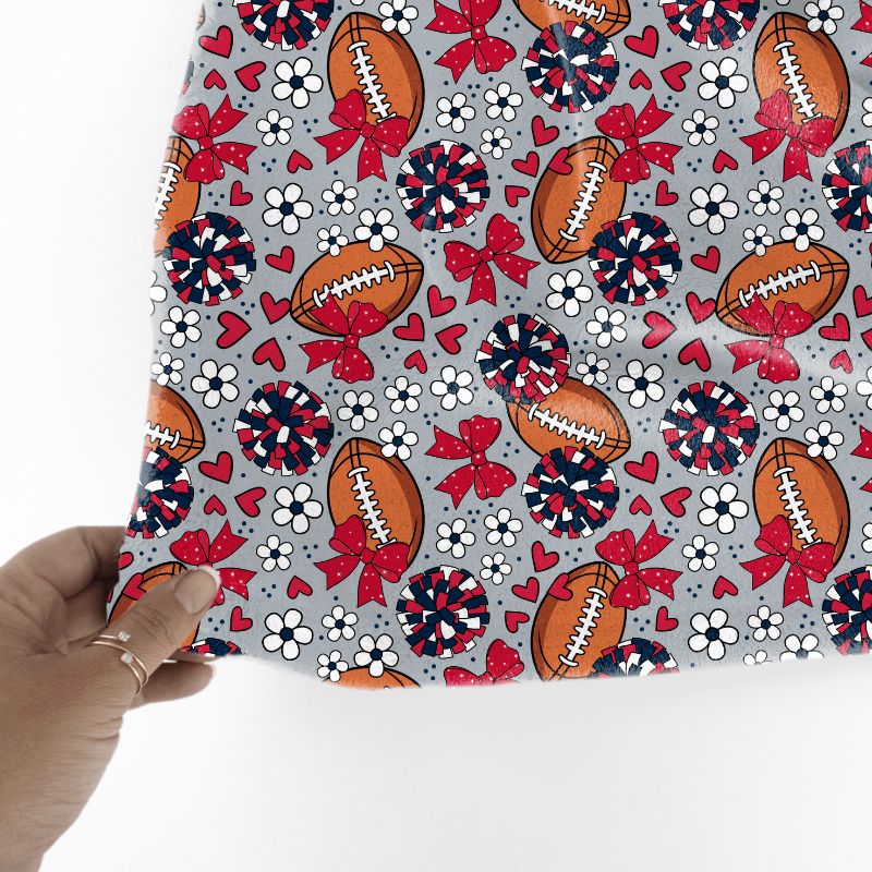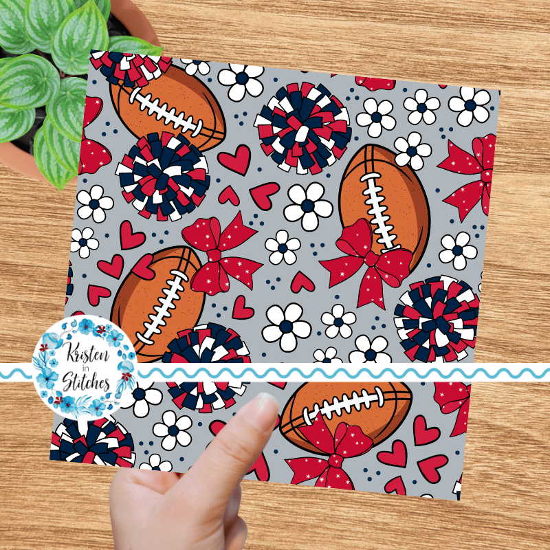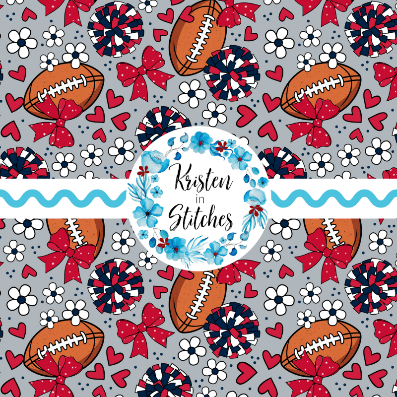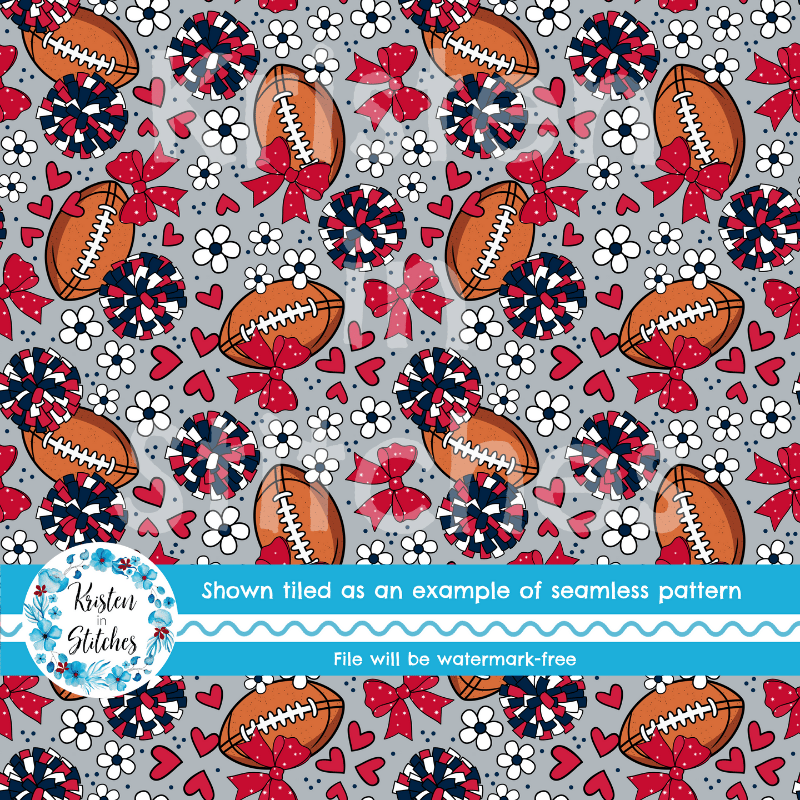 Floral pattern with daisy flowers, cheerleader bows, pompoms, footballs and hearts in New England Patriots colors, red, navy and silver.