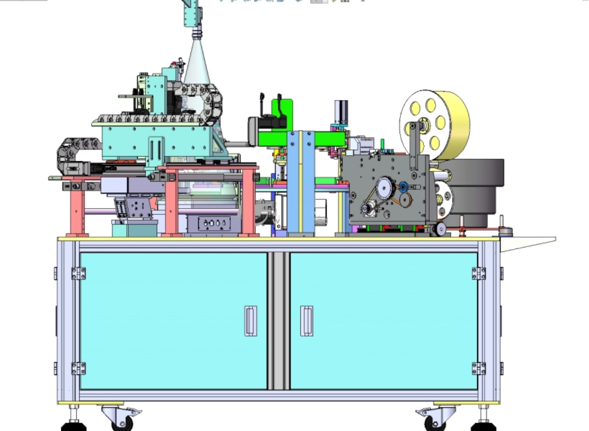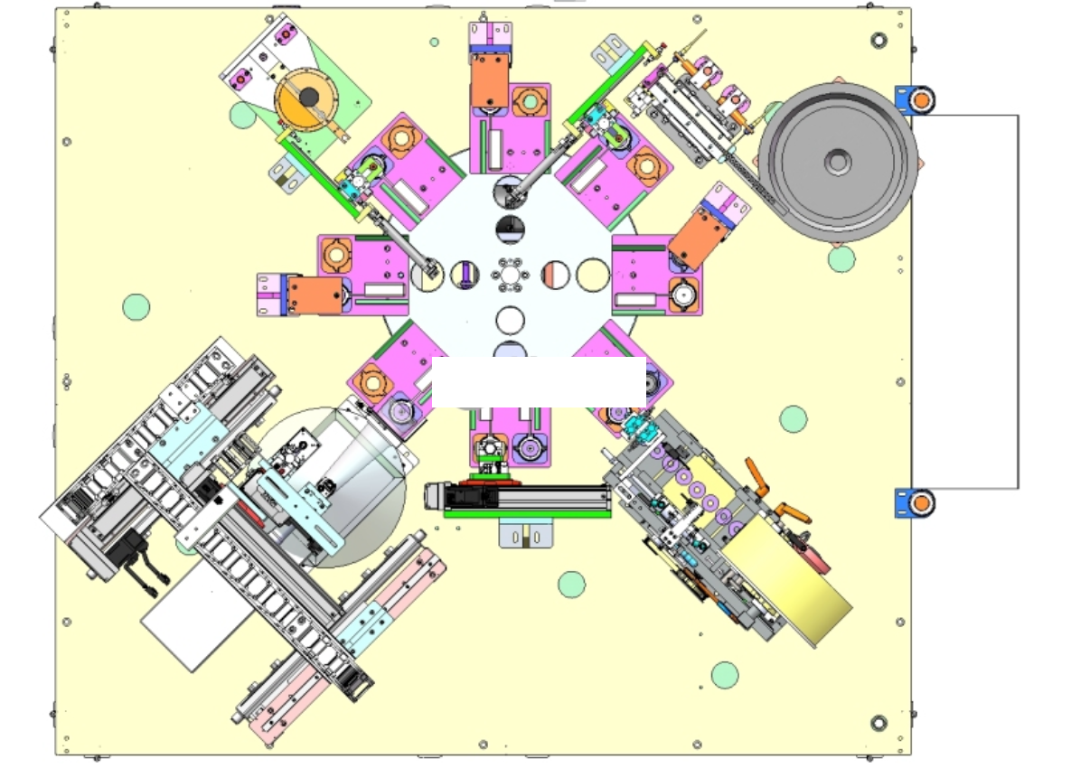 It mainly consists of a lower machine frame, an eight-station turntable, a labeling module, a vibrating feeding module, a vision-based material picking and transferring module, and other components.