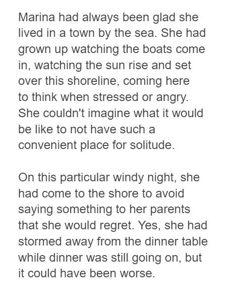 Marina had always been glad she lived in a town by the sea. She had grown up watching the boats come in, watching the sun rise and set over this shoreline, coming here to think when stressed or angry. She couldn't imagine what it would be like to not have such a convenient place for solitude.