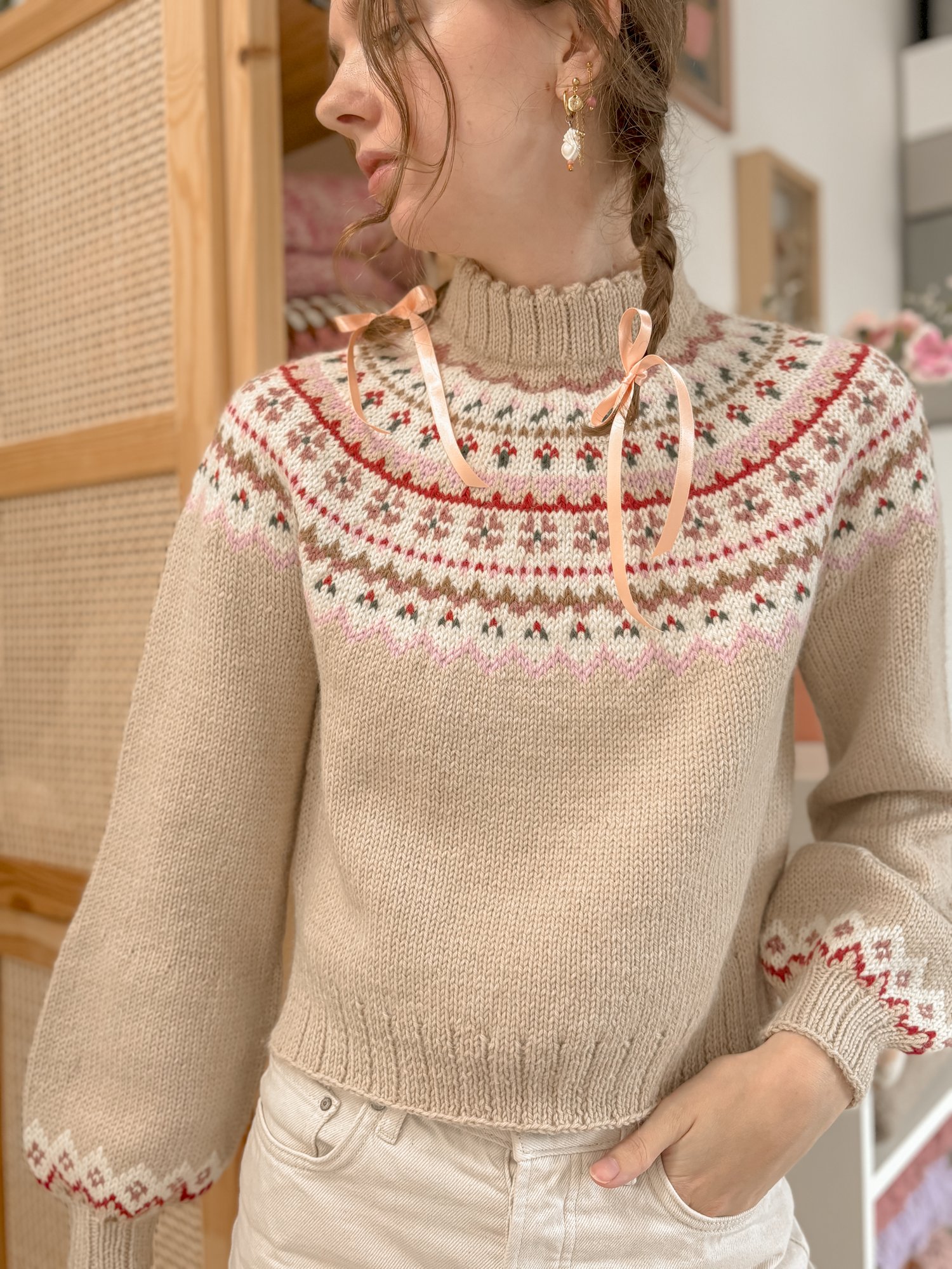 The sleeves are then separated and the body is worked in the round and finished with a split ribbed hem. Next the sleeves are worked in the round until the elbow where increases are made to create a bishop style sleeve. Lastly, we work the sleeve colorwork and finish the sleeve with a cinched ribbed cuff.