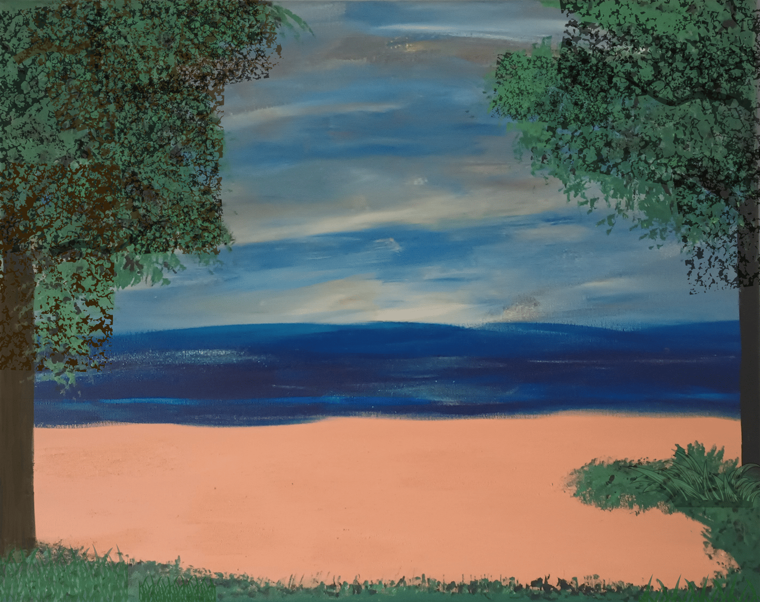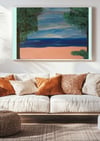 Capture a hushed moment where land meets lake, with soft blues, earthy greens, and a touch of early mist. Let this moody landscape bring peace, solitude, and calm to your space.