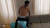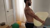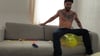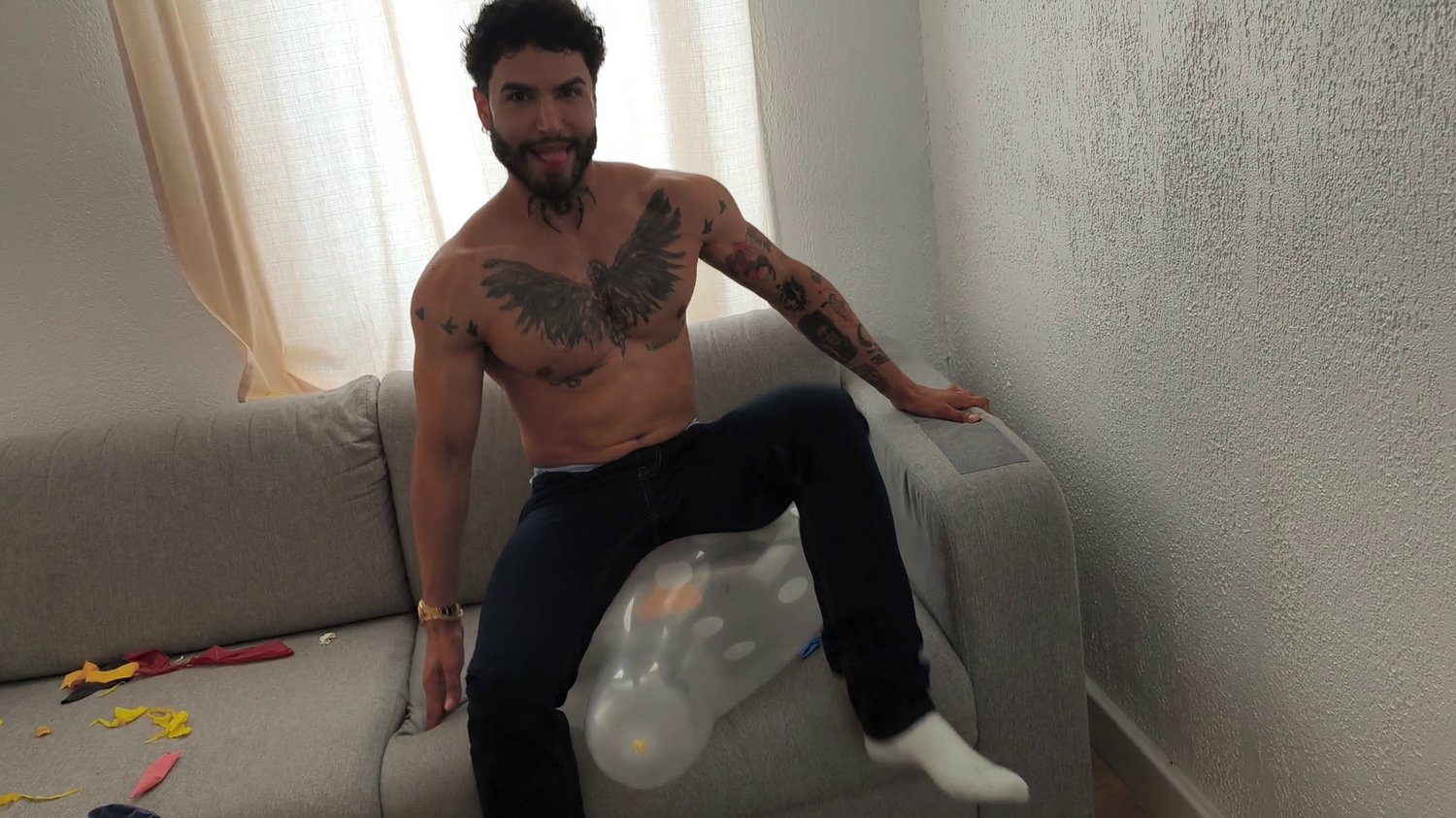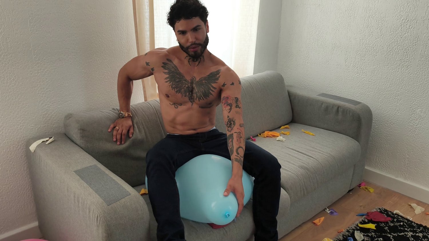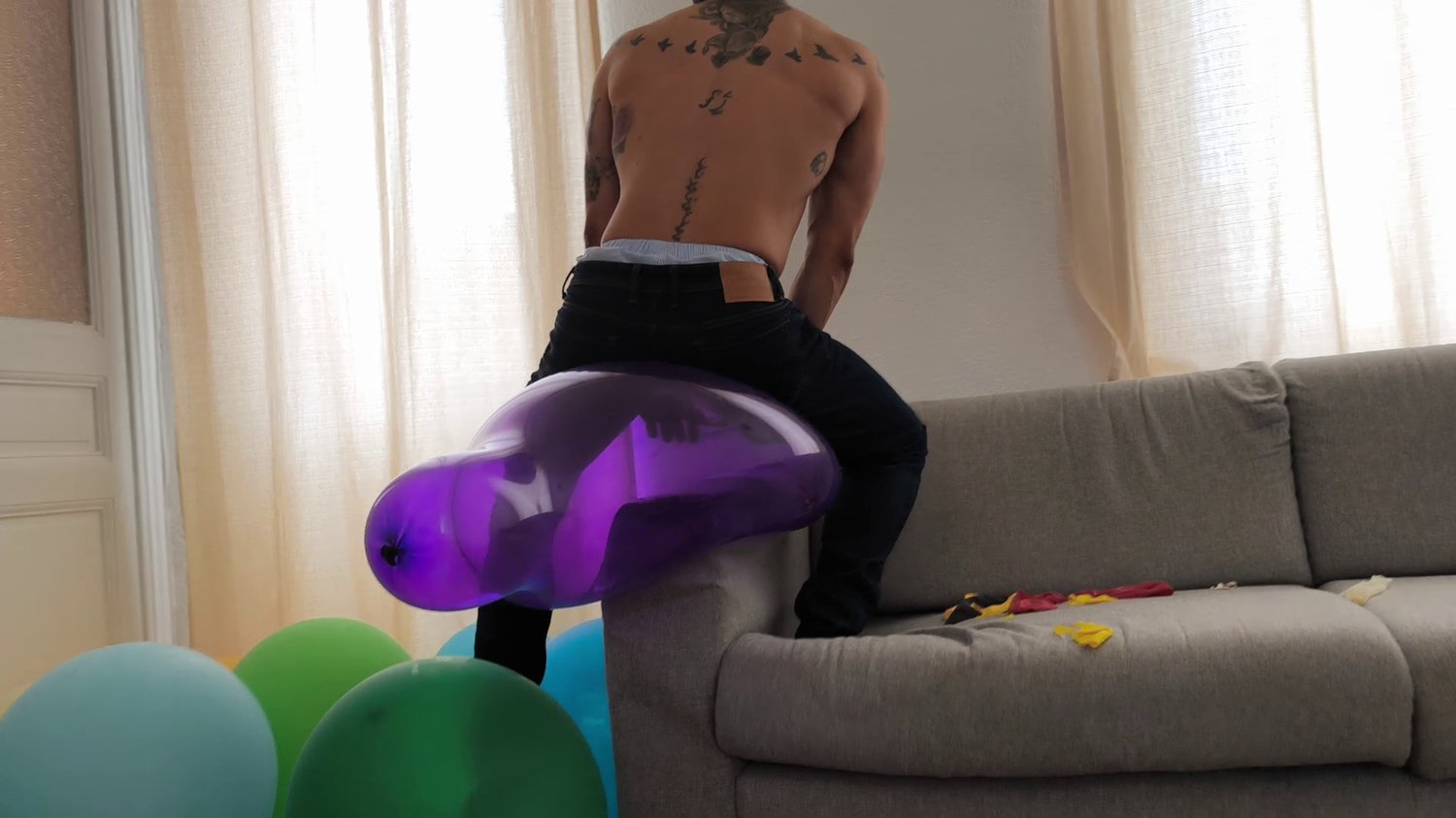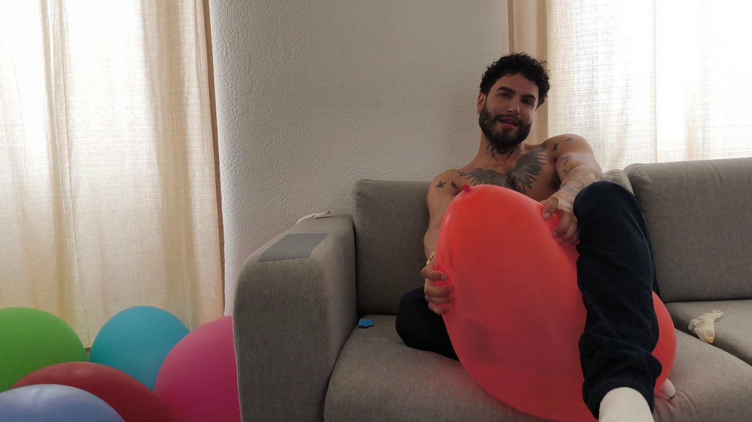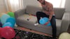 For this he use his hands but I think his favorite way of bursting the balloons is to sit pop them on the couch.
