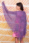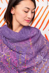 Antares is a triangular shawl that is worked from the top down, beginning with a tab cast on, and is shaped with increases worked on right side rows at both ends and on either side of the center stitch. Lace stitch grows out of the garter stitch rows that form the top of the shawl. Shawl is finished with a delicate beaded border.