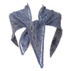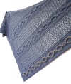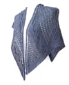 This asymmetrical triangular shawl is knit on the bias from one tip to the opposite edge. The shawl grows one stitch every two rows along the top edge. The 36-stitch wide lace and cable block repeats across each row to create all-over texture.
