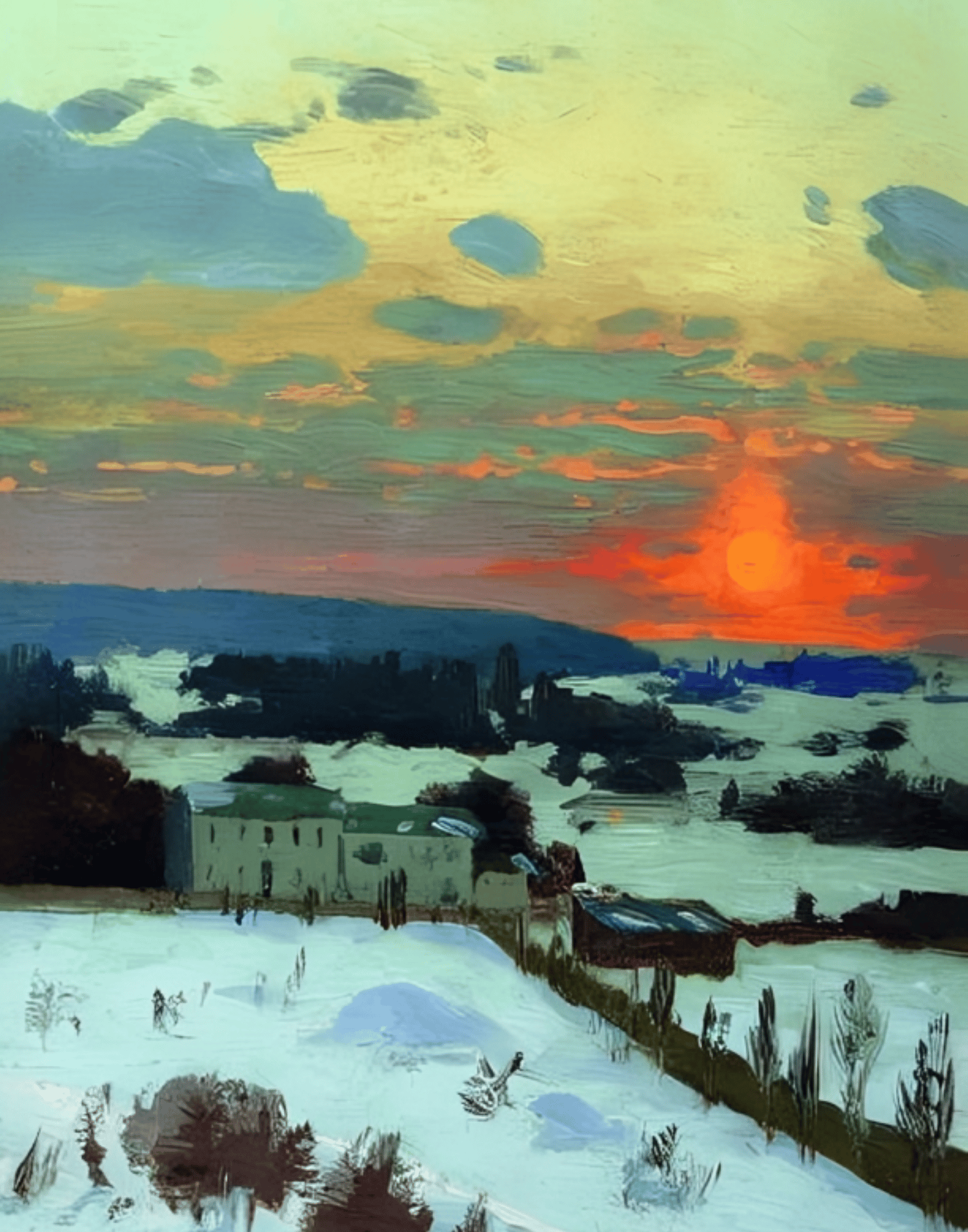 Snowy Village Wall art, Vintage Village, Top Art, Nostalgic Rural life, Nature, Cool Nature, Beautiful Nature, Sunrise, Natural Landscape, Wall Art, Digital Art.