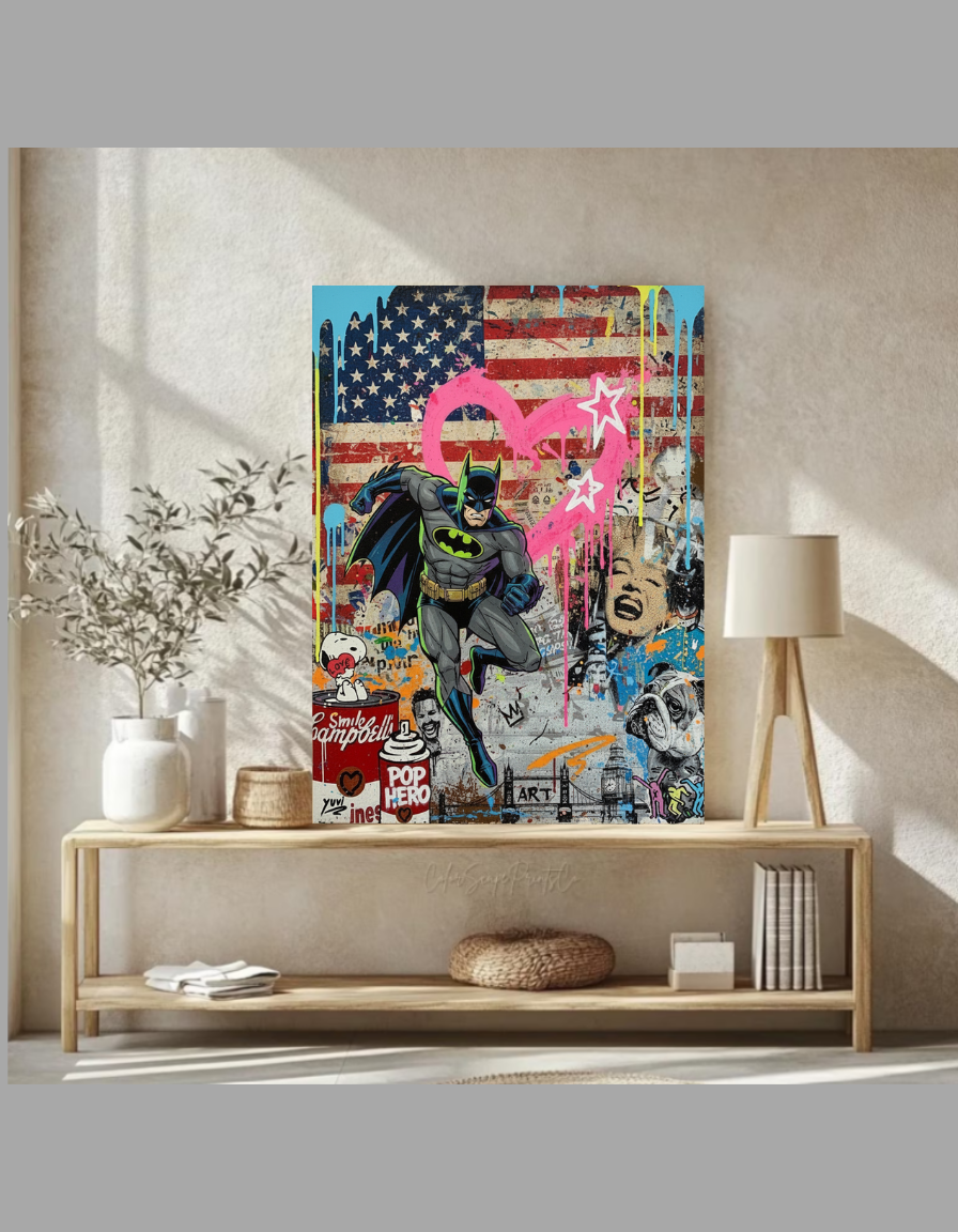 Batman Pop Art Print - American Flag Street Art Poster with Superhero Graffiti, Downloadable Wall Decor for Comic Fans