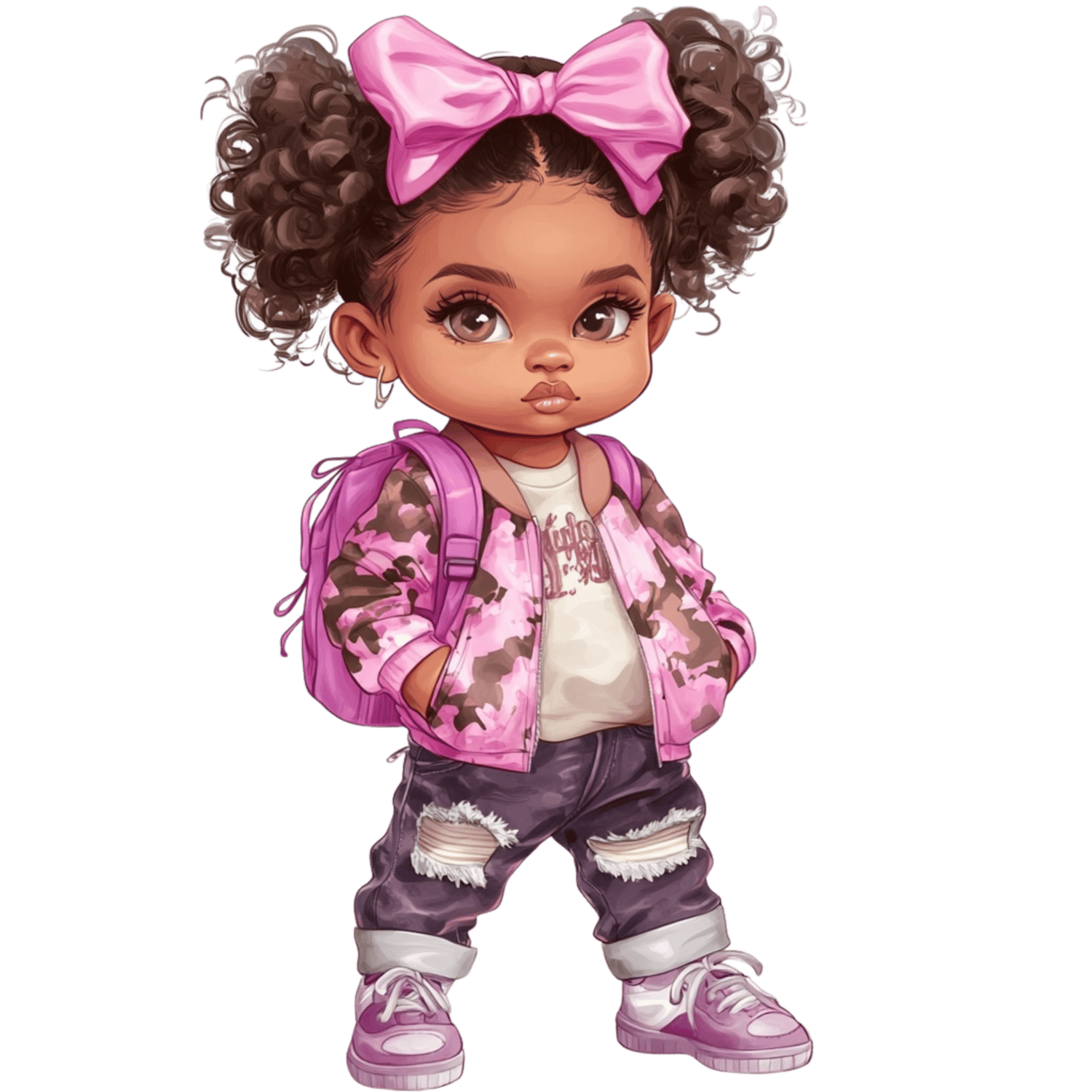 This cute digital design features a confident curly-haired little girl rocking a pink camo jacket, distressed jeans, pink kicks, and a matching bow and backpack. Perfect for back-to-school projects, journals, T-shirts, and more!