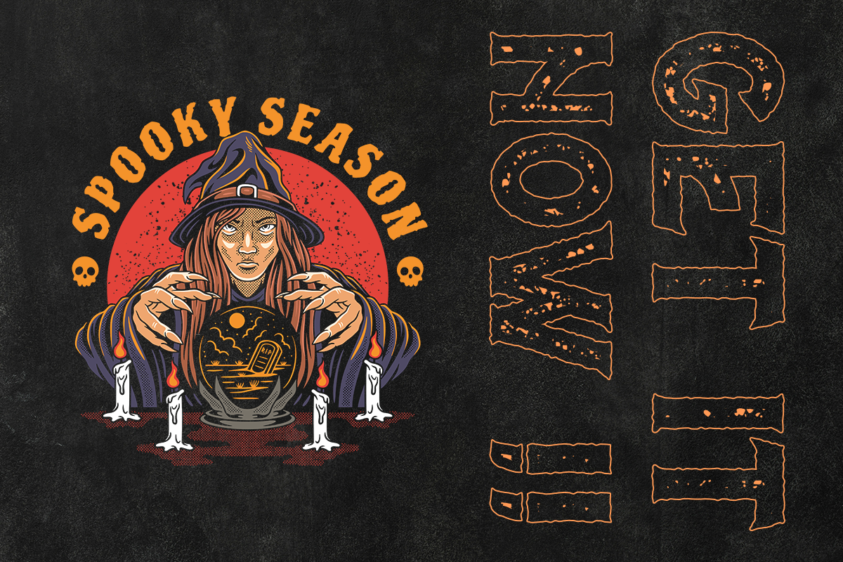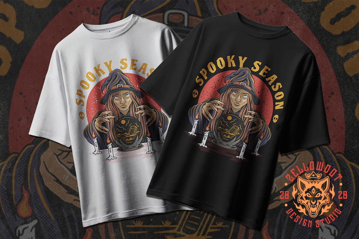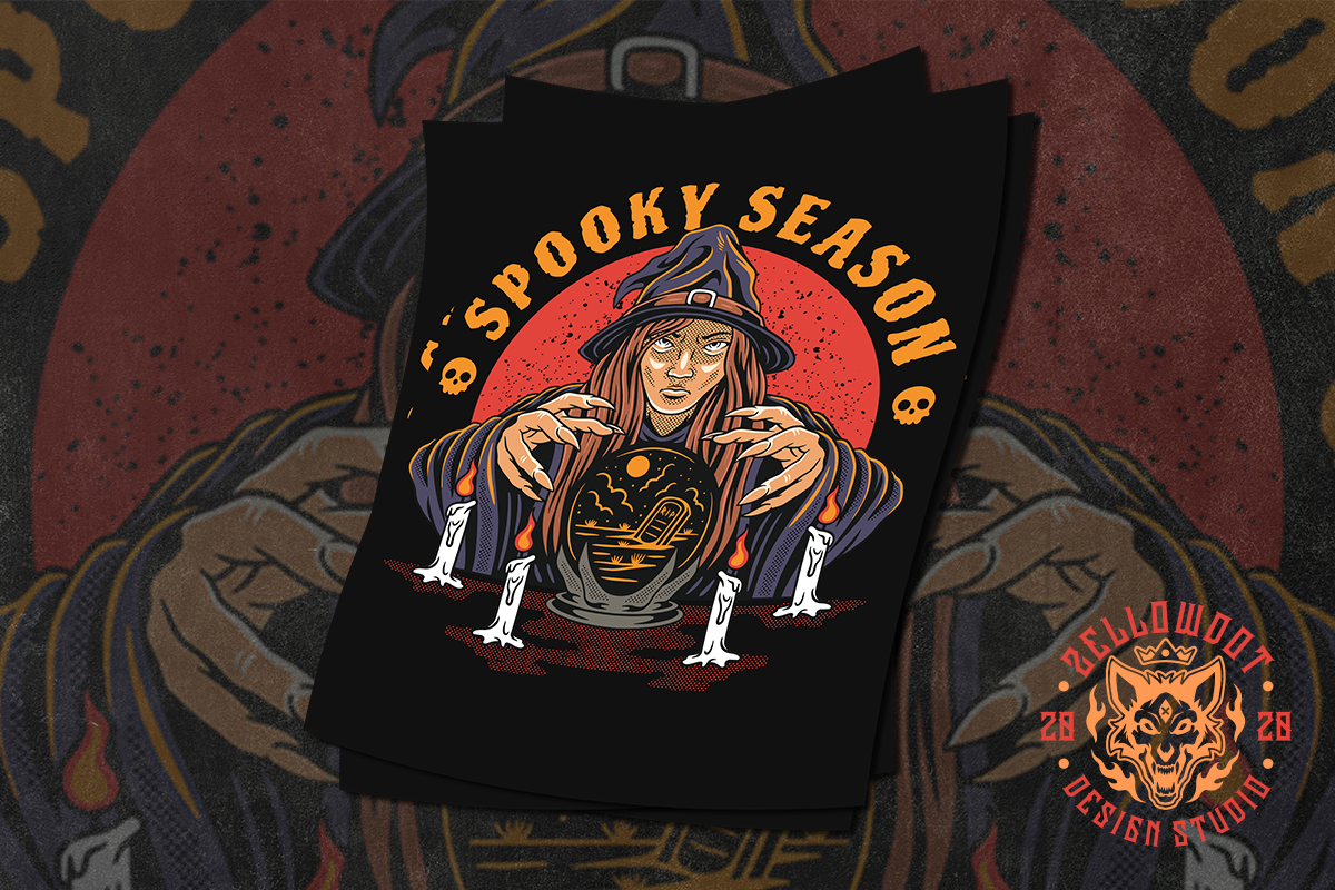 An enchanting Halloween illustration featuring a mysterious witch casting a spell over her glowing crystal ball. Surrounded by flickering candles and framed by a blood-red moon, this design captures the magic and mystery of the spooky season. With bold retro colors and vintage detailing, it's perfect for lovers of witchy aesthetics and Halloween vibes.