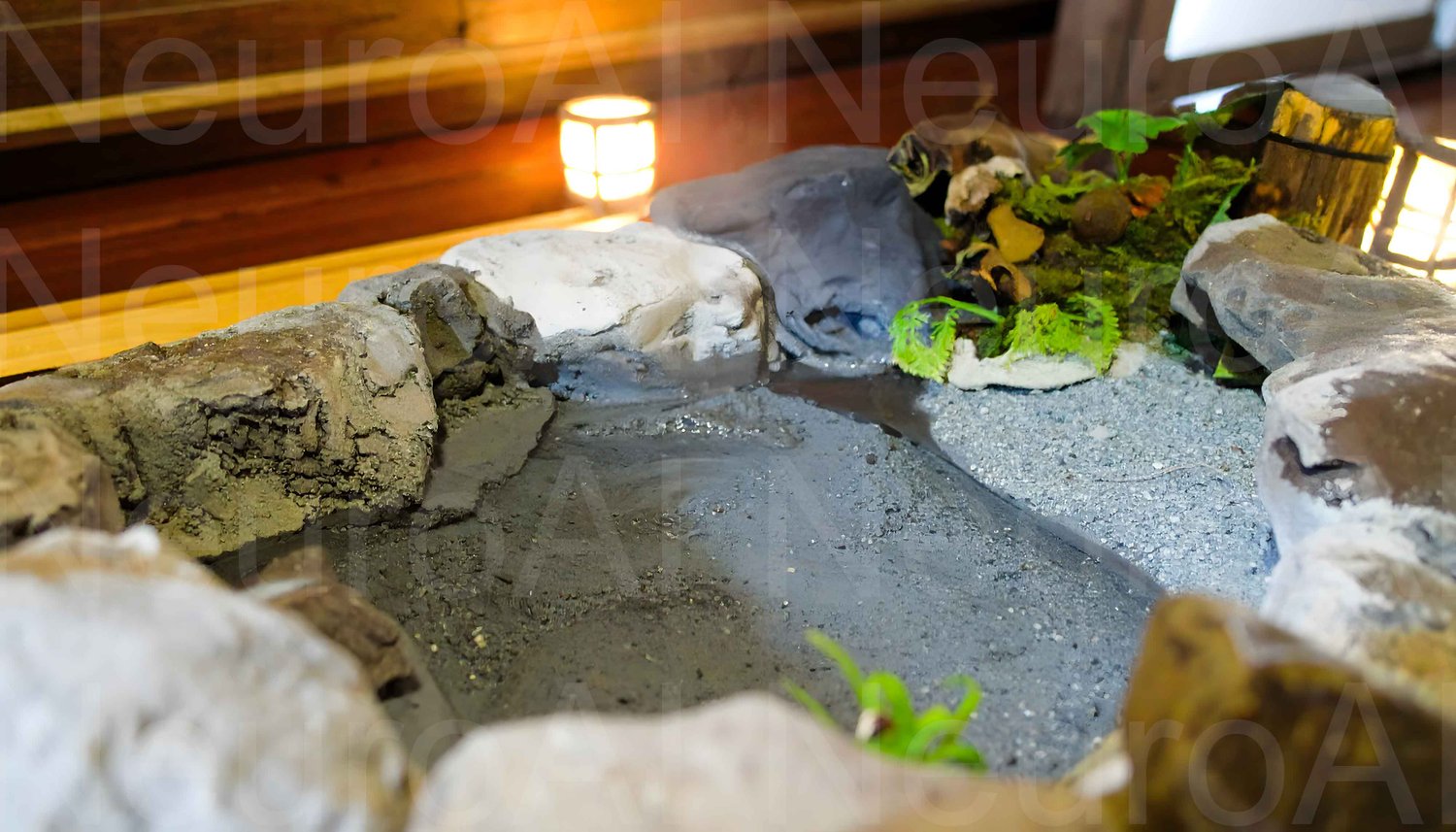 Tranquil pond with rocks and plants illuminated by soft light creates a peaceful and serene atmosphere