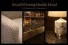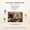 The collection showcases warm neutral palettes, marble feature walls, smoked walnut paneling, brushed brass accents, boucle seating, premium leather furniture and atmospheric architectural lighting designed to communicate wealth, comfort and exclusivity.