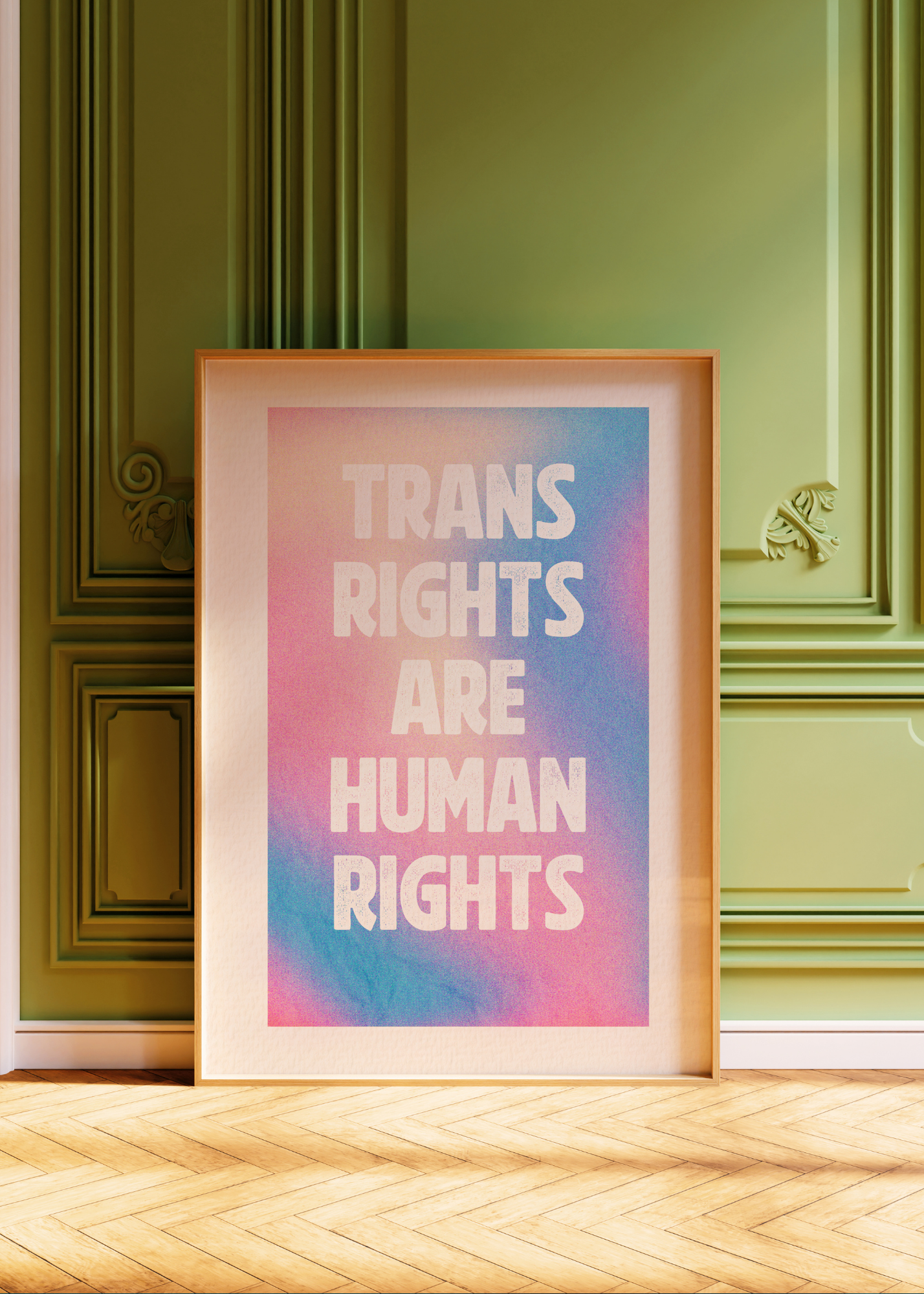 Trans Rights— Softly blended in hues of white, pink, and light blue, this print honors the colors of the trans flag and radiates warmth and love. In clean, bold white block lettering, the message is simple but powerful: "Trans rights are human rights." A gentle, affirming reminder that every person deserves dignity, safety, and love, exactly as they are.