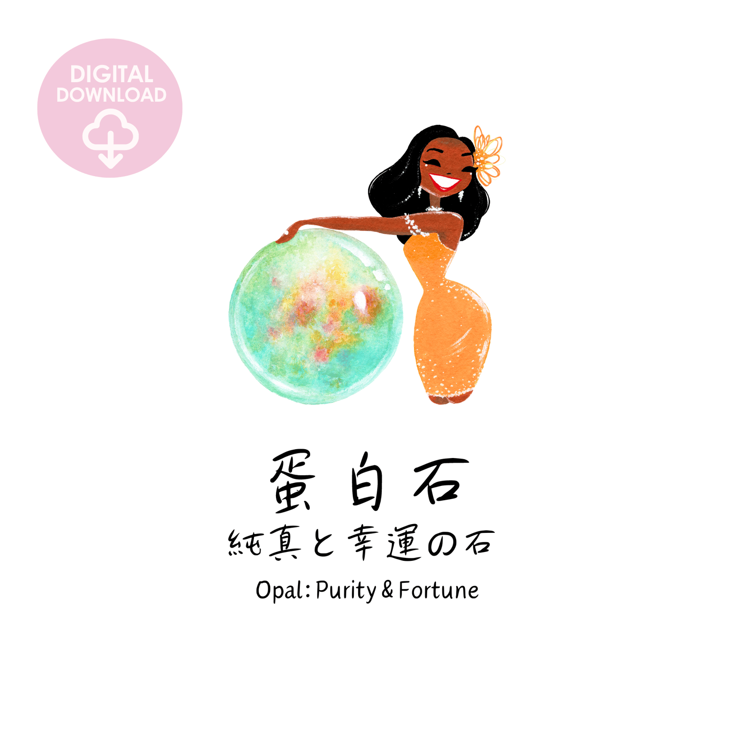 Enhance your decor with this stylish wall art featuring the October birthstone, opal. The illustration of a fashionable woman, combined with the meaning of the opal gemstone in both English and Japanese, creates a piece that is both visually appealing and culturally rich. This printable wall art offers museum-quality design and a mystical touch to any room.