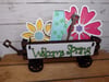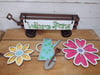 This set is a sign that spring is around the corner! This set has a sweet little watering can and shovel,and a large daisy with heart petals, and a smaller bright yellow flower that screams spring is here! Also comeswith a Welcome Spring sign and two hooks for the front of the wagon. Can be purchased painted or BlankĀ