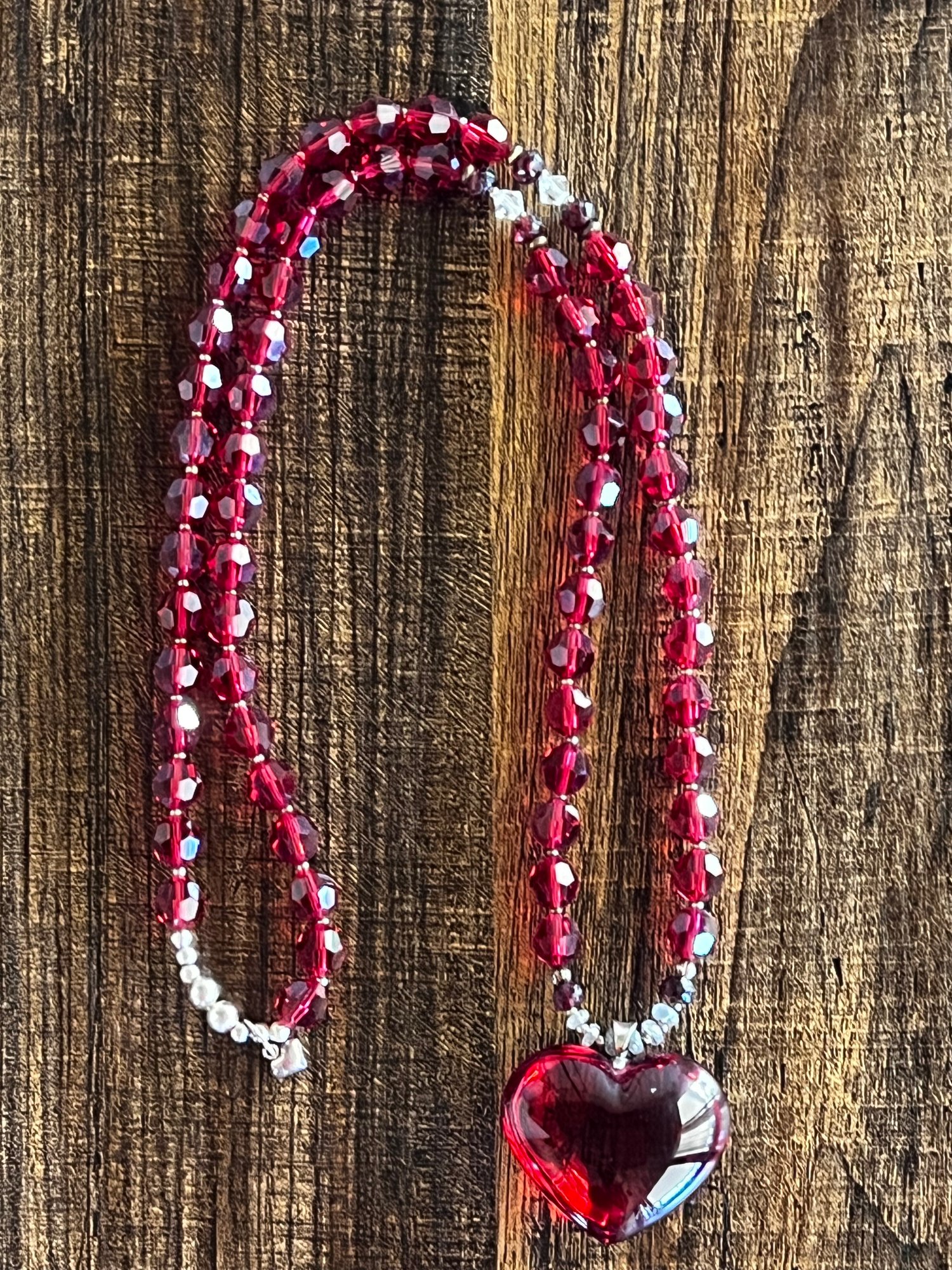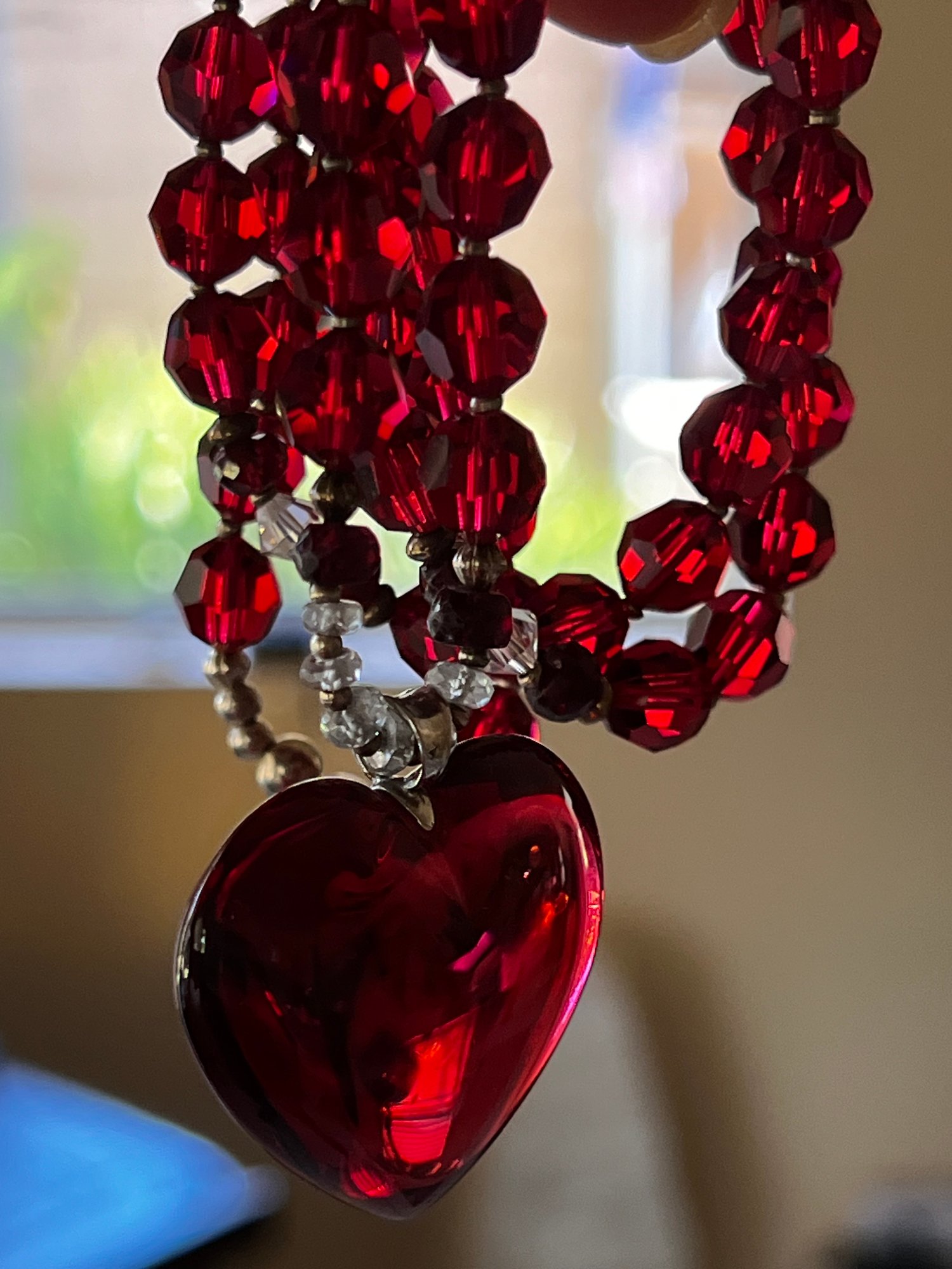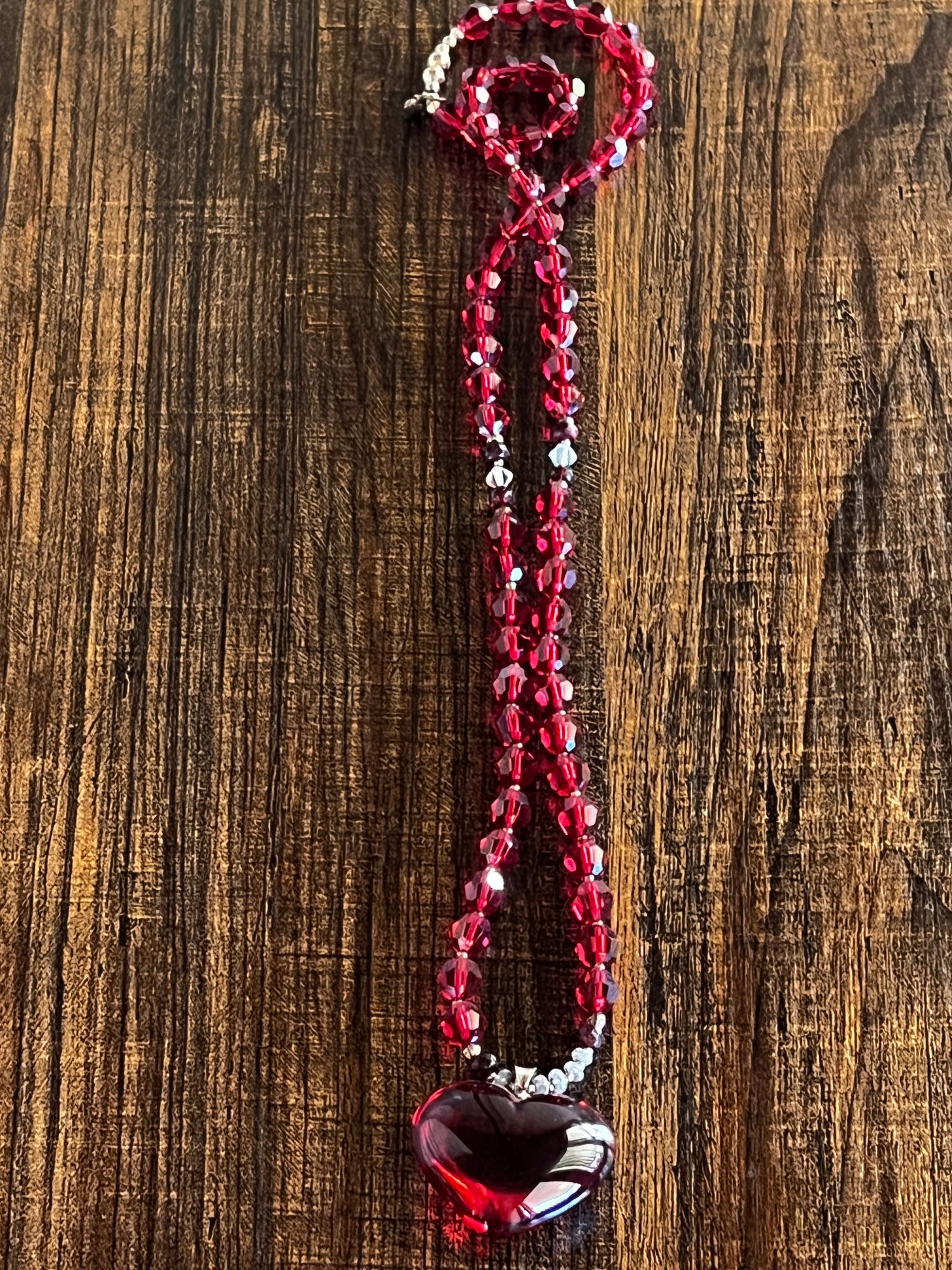Mala Strand is a combination of Swarovski beads, rubies, and white sapphires and Baccarat Crystal Heart.