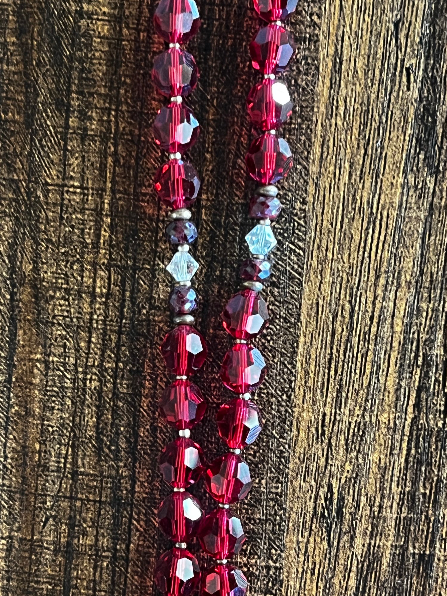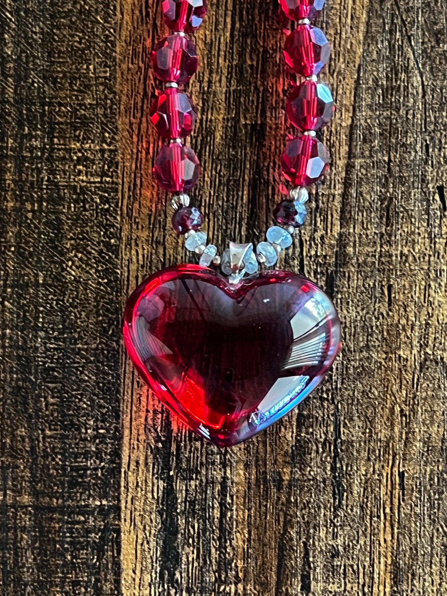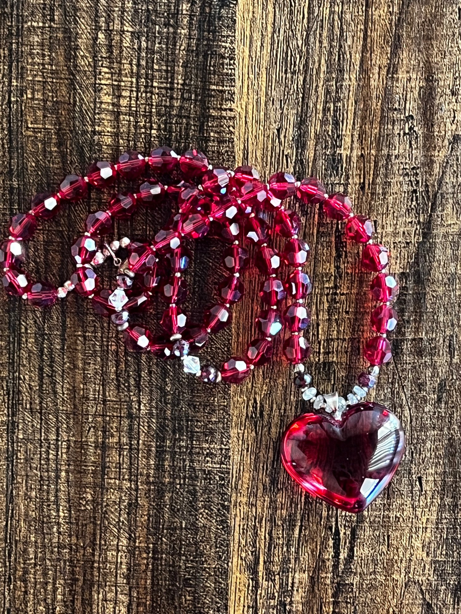 Mala Strand is a combination of Swarovski beads, rubies, and white sapphires and Baccarat Crystal Heart.