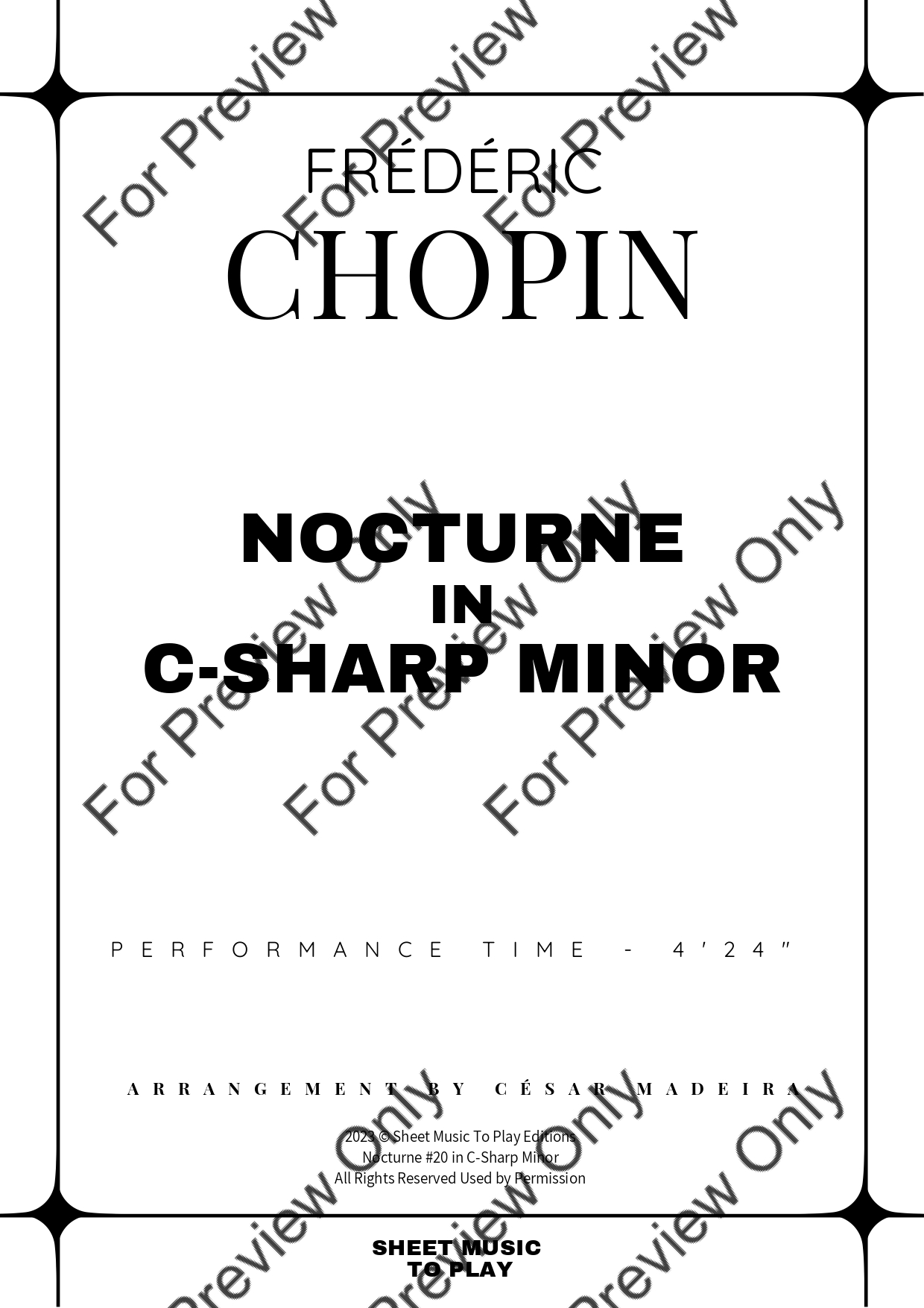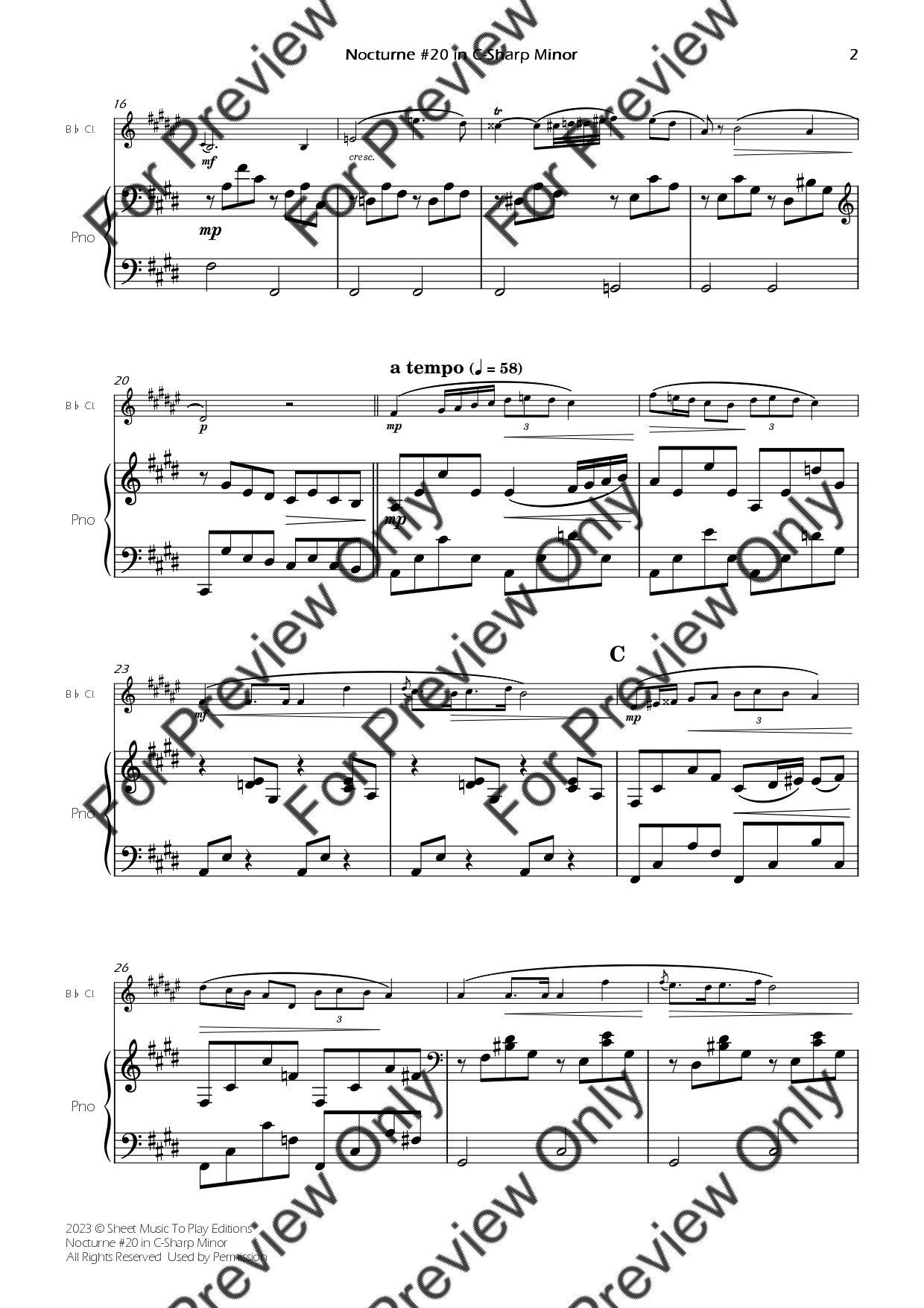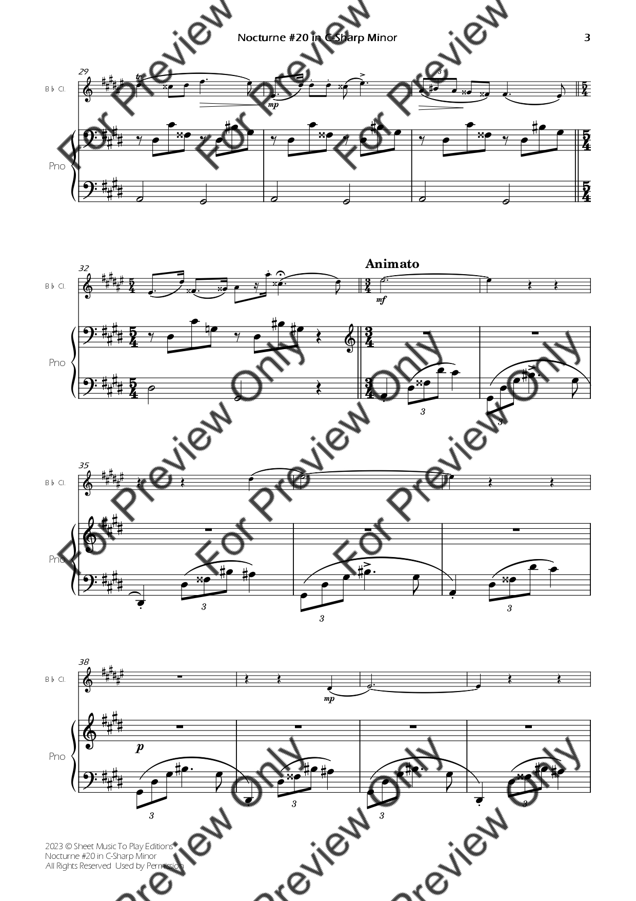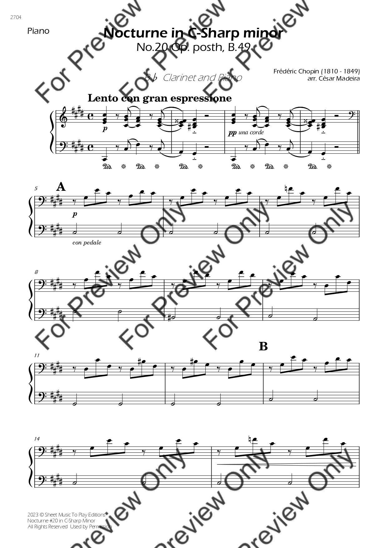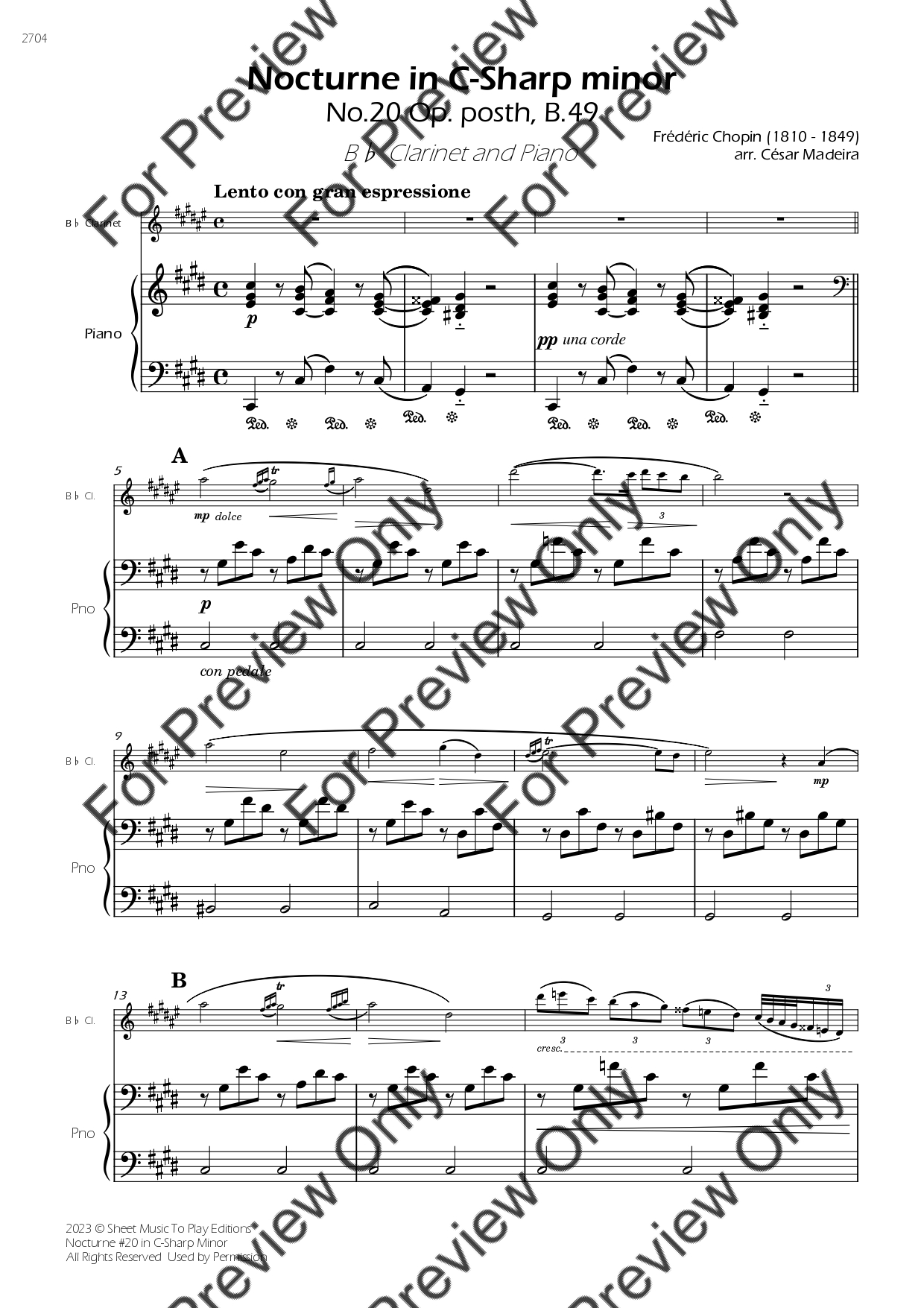 Nocturne No.20 in C-Sharp minor by Frederic Chopin. Arrangement for Bb Clarinet and Piano. With Full Score and Individual Parts. Have fun!