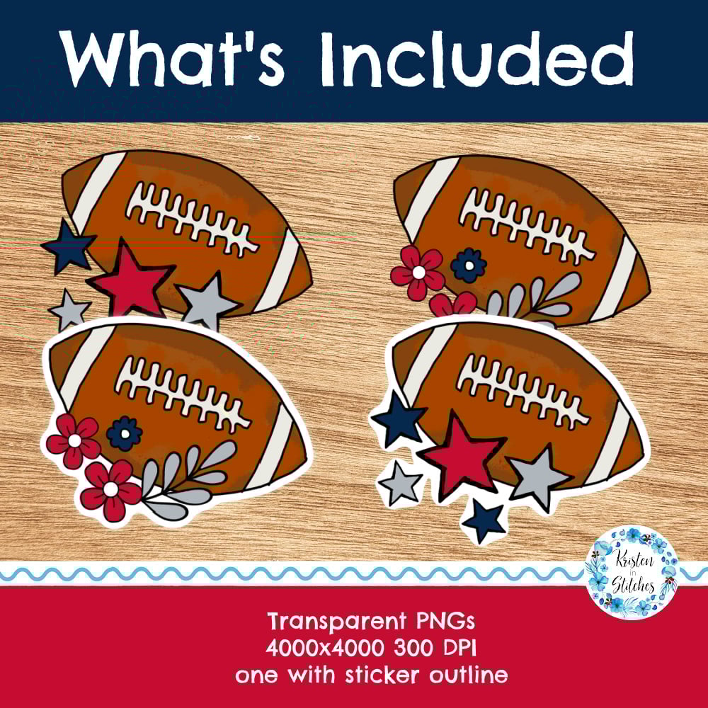 Large printable football team graphics in New England Patriots colors red, navy and silver. Includes a flower design and a star design.