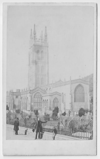 shows two gentlemen with top hats, and a boy sat on the wall; man in the churchyard