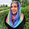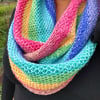 Vespers are the prayers said at evening, from the Latin word for evening, which are meditative and repetitive. This design can also be described that way. The “cheater” brioche stitch used in the pattern is easy to memorize, and can be done at a relaxed pace without too much concentration; providing all the squish of garter stitch, with a little more interest. It is perfect for comfort or prayer knitting. This infinity scarf can be worn long, doubled around the neck, wrapped over the ears for extra warmth (or as a head covering for Vespers), or even as a shrug of sorts.