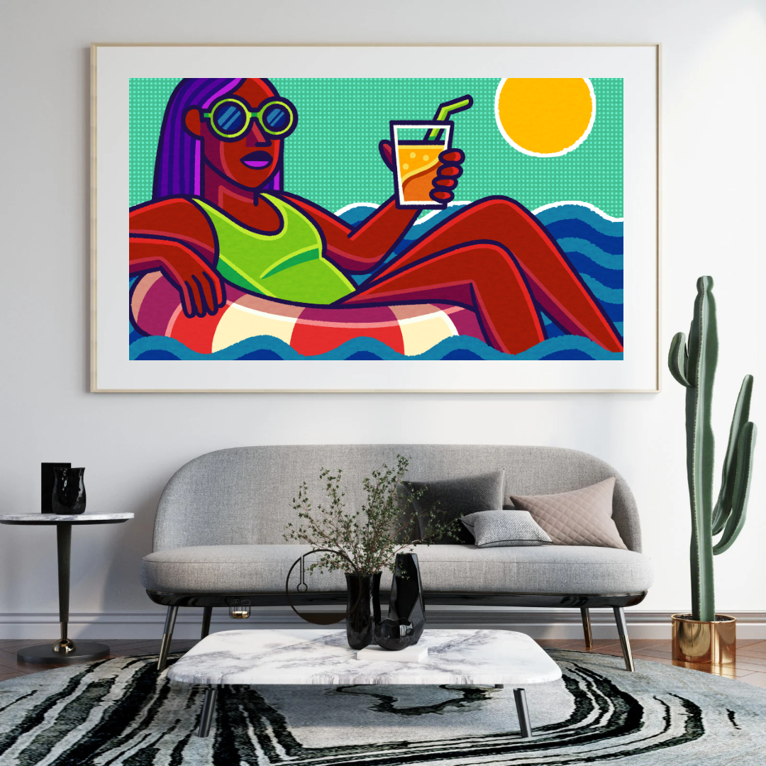 Summertime Vibes is a splash of carefree joy, showing a woman soaking up the sun, floating peacefully on the waves with a cold drink in hand. It’s all about that perfect summer moment—bright, breezy, and blissfully undisturbed. This artwork celebrates freedom, relaxation, and the simple pleasure of being fully present, where the only thing that matters is the warmth of the sun and the rhythm of the sea.