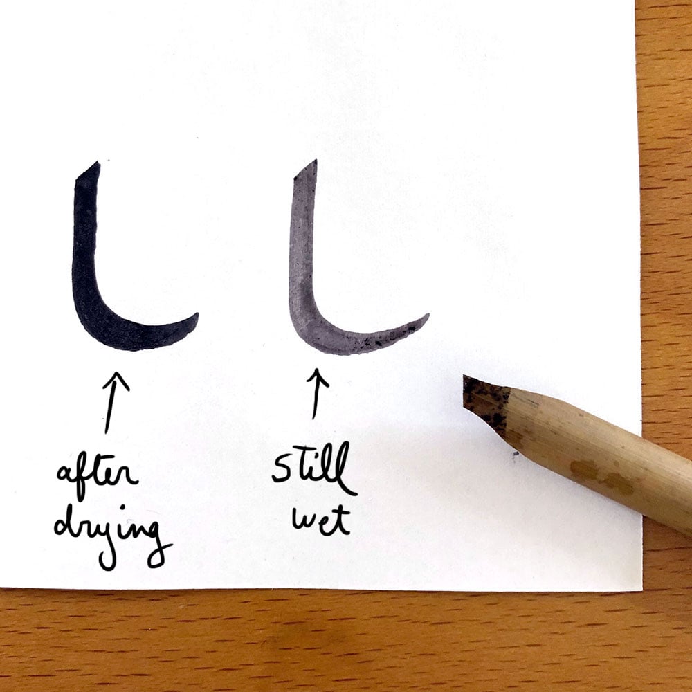 Tannine inks are thinner than today's black inks (which are carbon-based and technically are thin paints), with a wider range from deep black to transparent grey depending how much liquid is deposited on the paper. This black ink darkens as it dries, as exposure to air oxidises its iron contents.