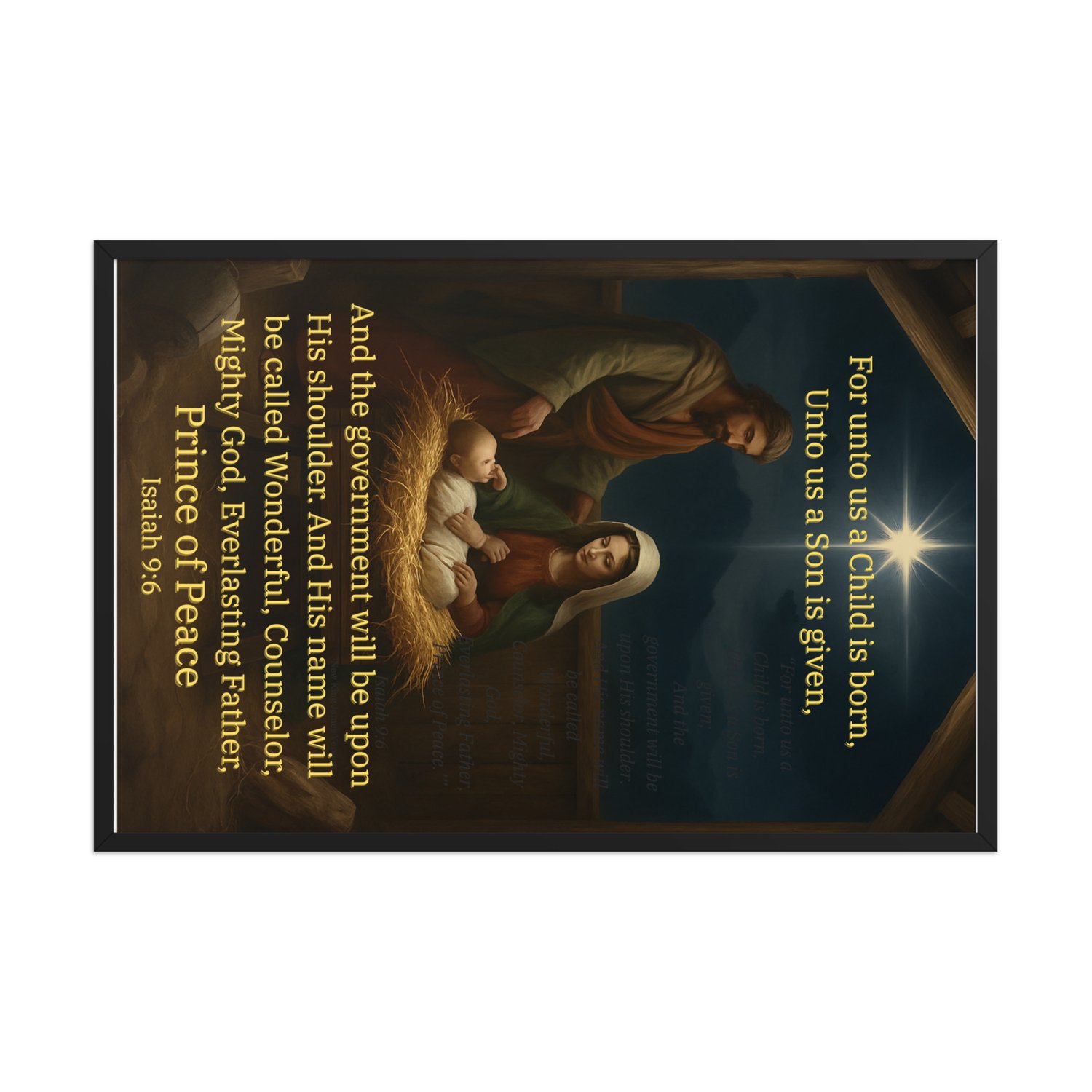 Isaiah 9:6 For unto us a child is born, framed poster ready to hang. This one is perfect for Christmas or year round. Beautiful picture of Joseph, Mary, and Baby Jesus under the Star of Bethlehem featuring the Bible Verse from Isaiah 9:6.