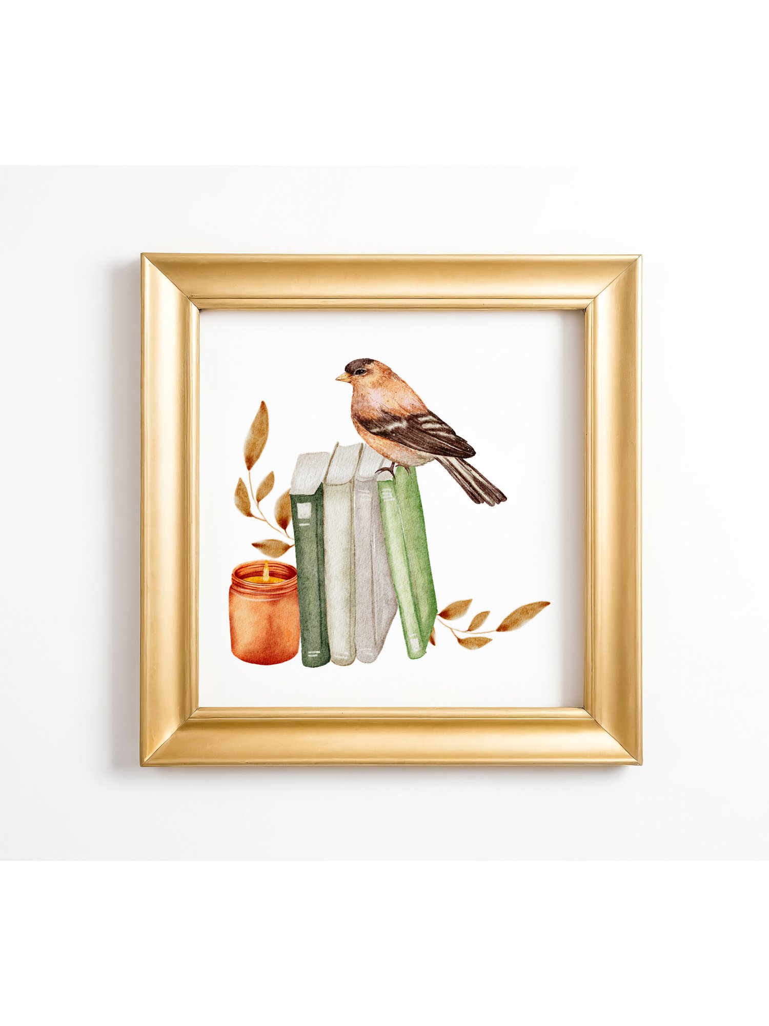Bring a sense of calm, curiosity, and cozy charm to your space with this whimsical wall art digital download. Featuring a delicate bird perched atop a stack of softly colored books, accented by gentle botanical elements and a warm candle glow, this illustration celebrates quiet moments, reading nooks, and a love for nature.