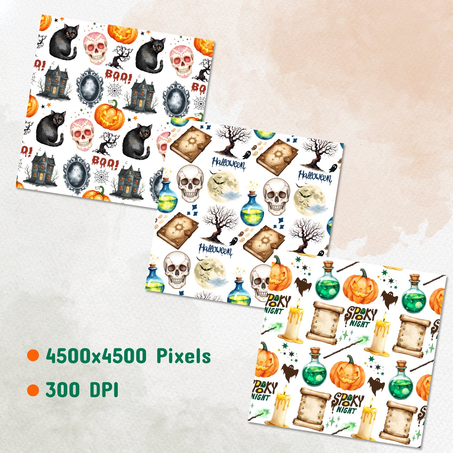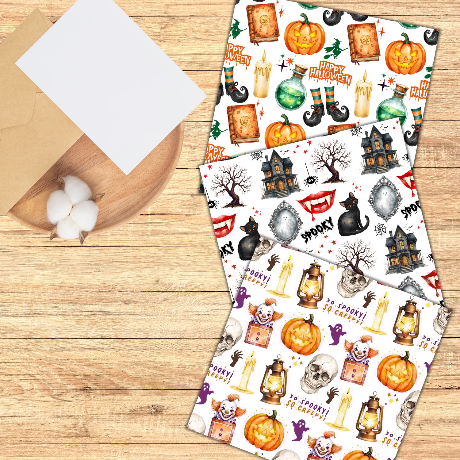 Creating Halloween-themed invitations, party printables, greeting cards, gift wrap, treat bags, planner stickers, scrapbooking pages, social media graphics, product packaging, and seasonal fabric designs. The seamless format makes it easy to apply these patterns to both digital and printed projects.