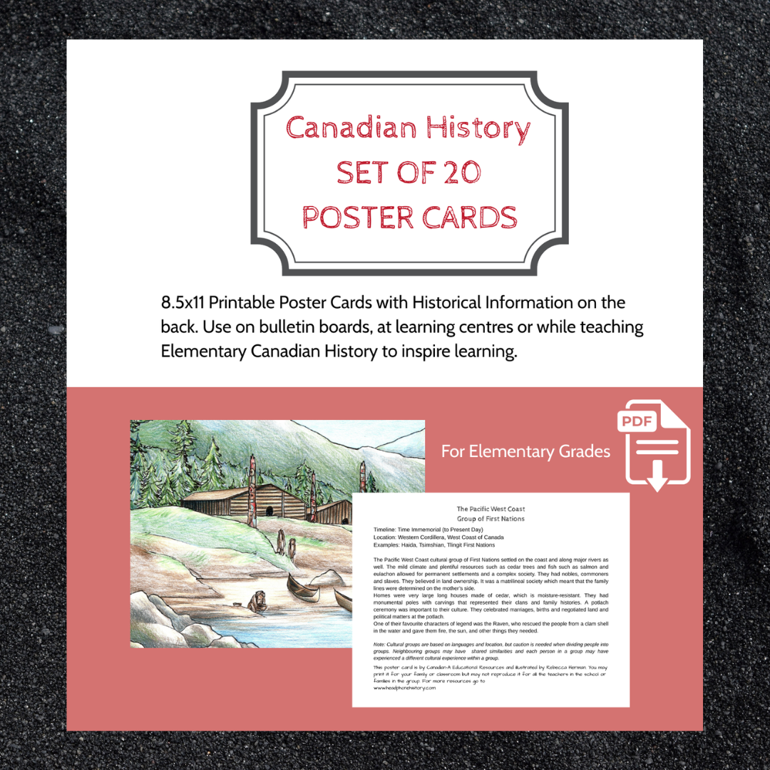 8.5x11 Printable Poster Cards with Historical Information on the back. Use on bulletin boards, at learning centres or while teaching Elementary Canadian History to inspire learning. This is a PDF Digital Download for you to print.