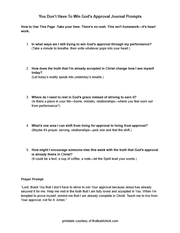 Use this page to pause, reflect, and write as you sink into the freedom that God’s approval is already yours through Christ. Print it, journal on it, or share it with someone you love.