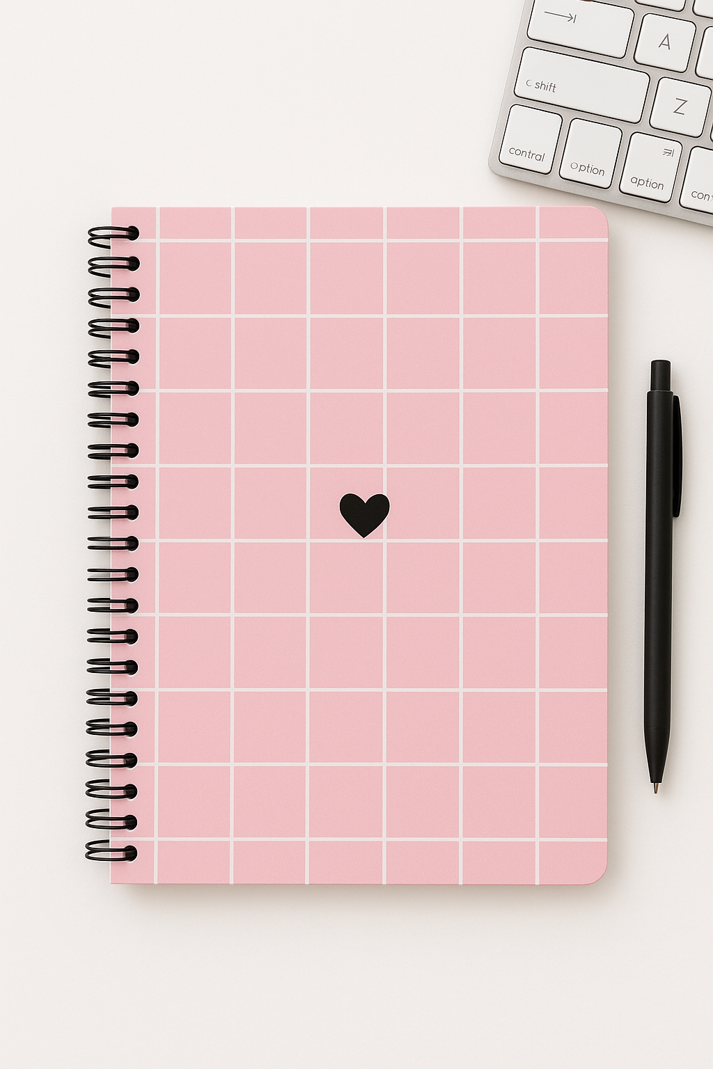 Add a touch of elegance to your daily writing with this soft pink grid notebook featuring a simple black heart at the center. Perfect for students, creatives, journaling lovers, and anyone who enjoys a clean and modern aesthetic.