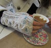 These little mitts have a cable that looks like a “plait” or long braid. There is no separate thumb, but the opening is placed to create a soft gusset and cover the bottom of the thumb. The fabric is flexible, fitting most hand sizes. The pattern tells you how to adjust both the arm and hand lengths.