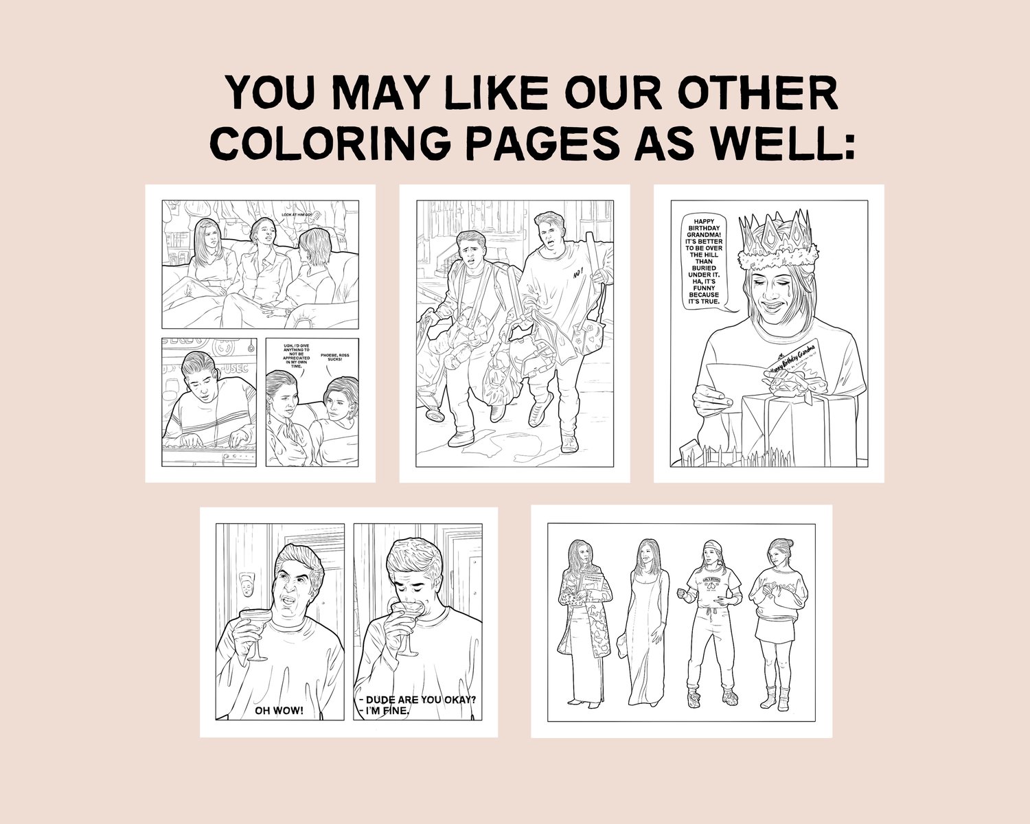 Do you love friends, the popular TV show or are you looking for the perfect gift for a friends fan? This downloadable and printable coloring page is what you're looking for! It's a high quality PDF of a detailed, selfmade illustration. Relive some of the best moments and funniest jokes of the show with all the main characters: Rachel Green, Monica Geller, Chandler Bing, Joey Tribbiani, Ross Geller, Phoebe Buffay