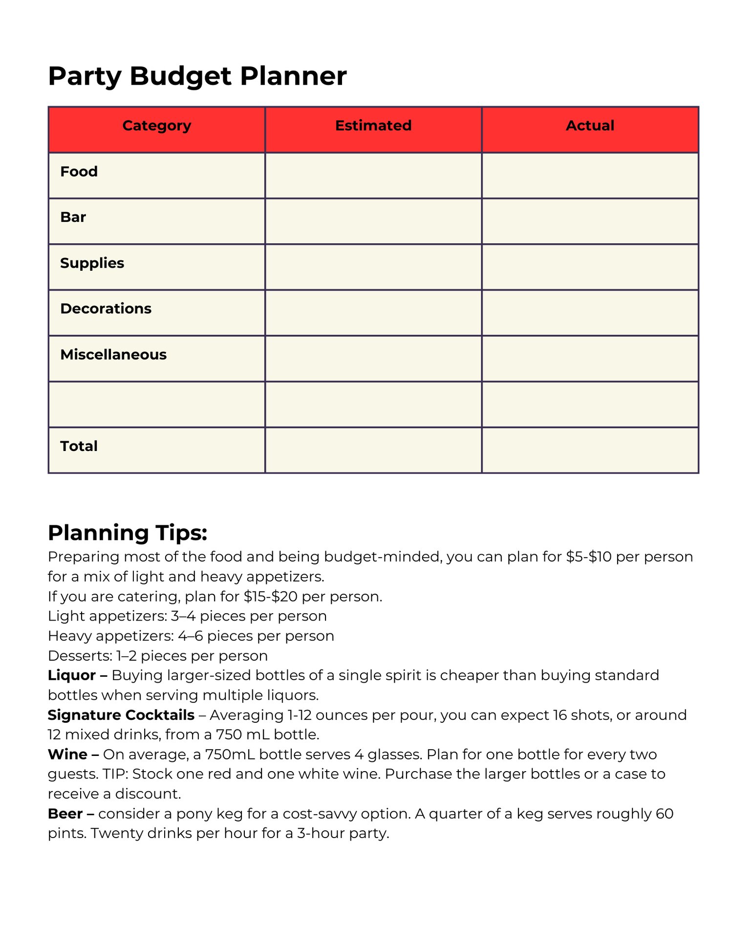 • Printable version for binders, clipboards, or party folders